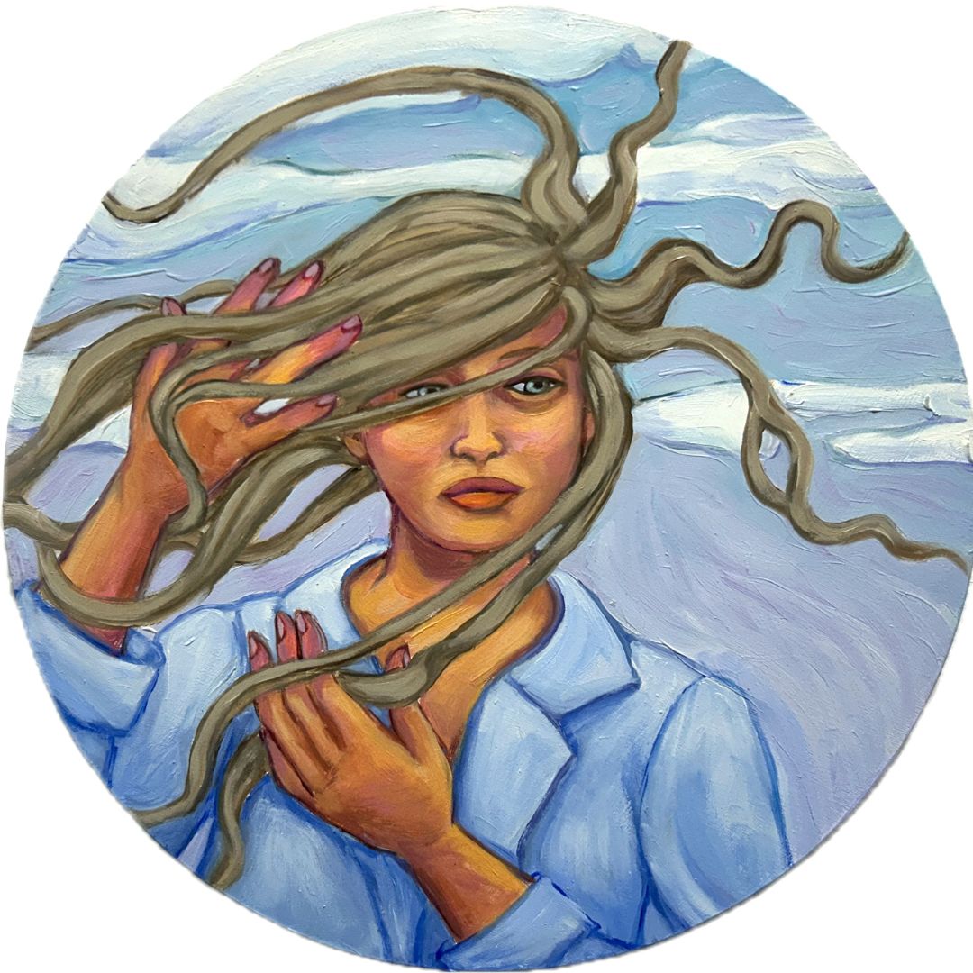 In Sleepwalking, Kay Sarver delves into the surreal landscape of the subconscious, drawing from vivid imagination and personal history. Her oil paintings blend dreamlike imagery with symbolic references to Tarot archetypes, reflecting both vulnerability and resilience amid turbulent times.