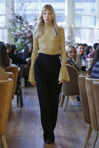 NEW YORK — A lot of designers have cut back their presence at New York Fashion Week, but Adam Lippes took a different route. He staged his first-ever full-scale runway show to unveil his fall collection at the trendy new brasserie Veronika, with a lavish breakfast for guests, served by waiters at individual tables covered in crisp white tablecloths as models circulated in the Renaissance Revival surroundings.