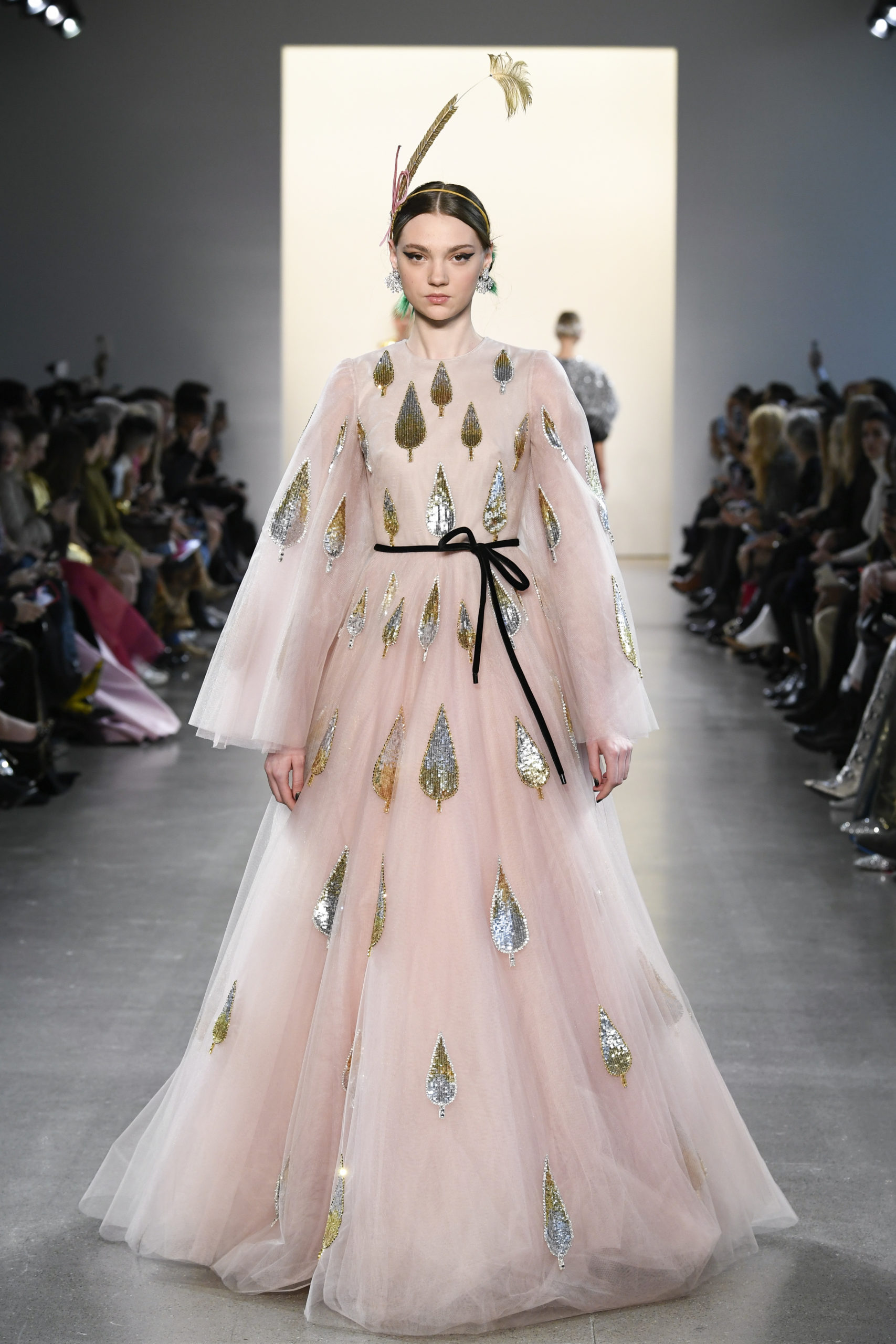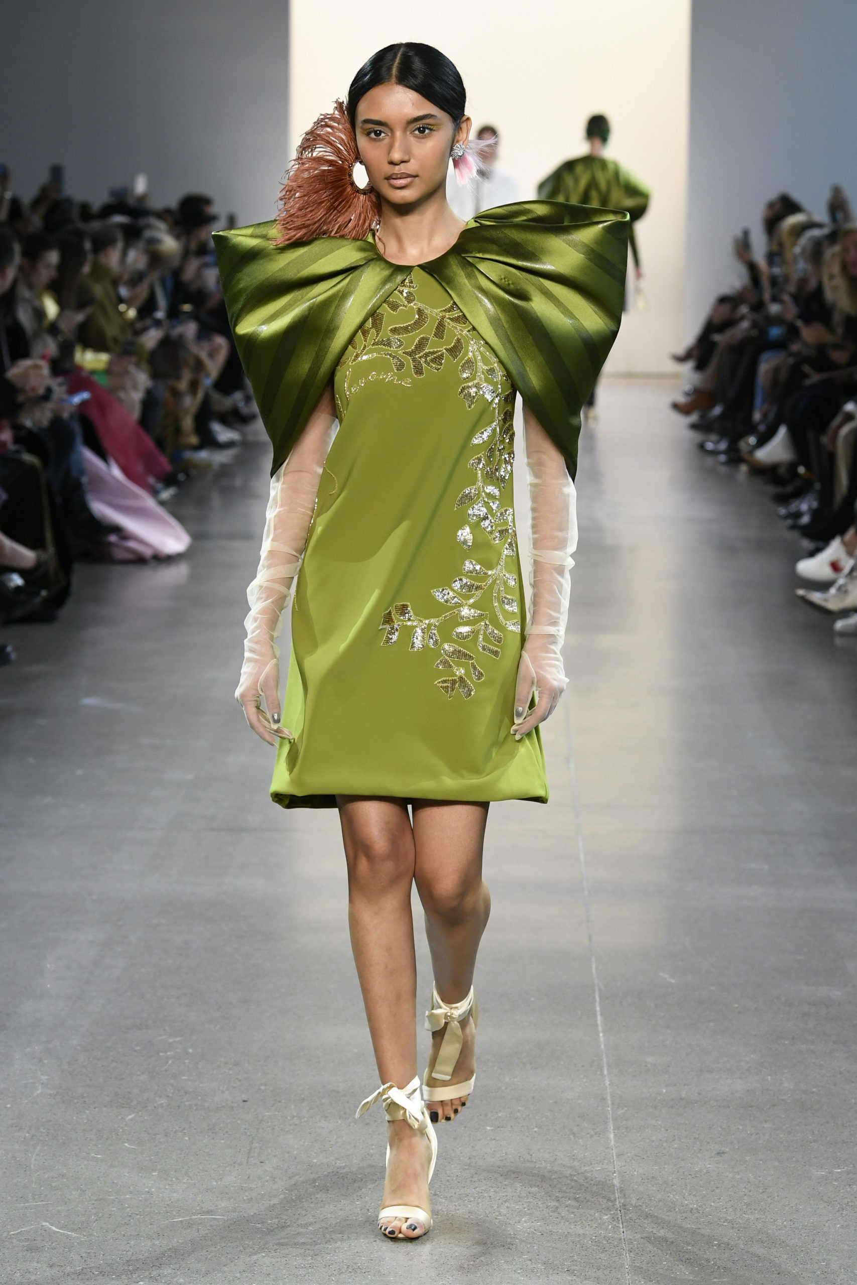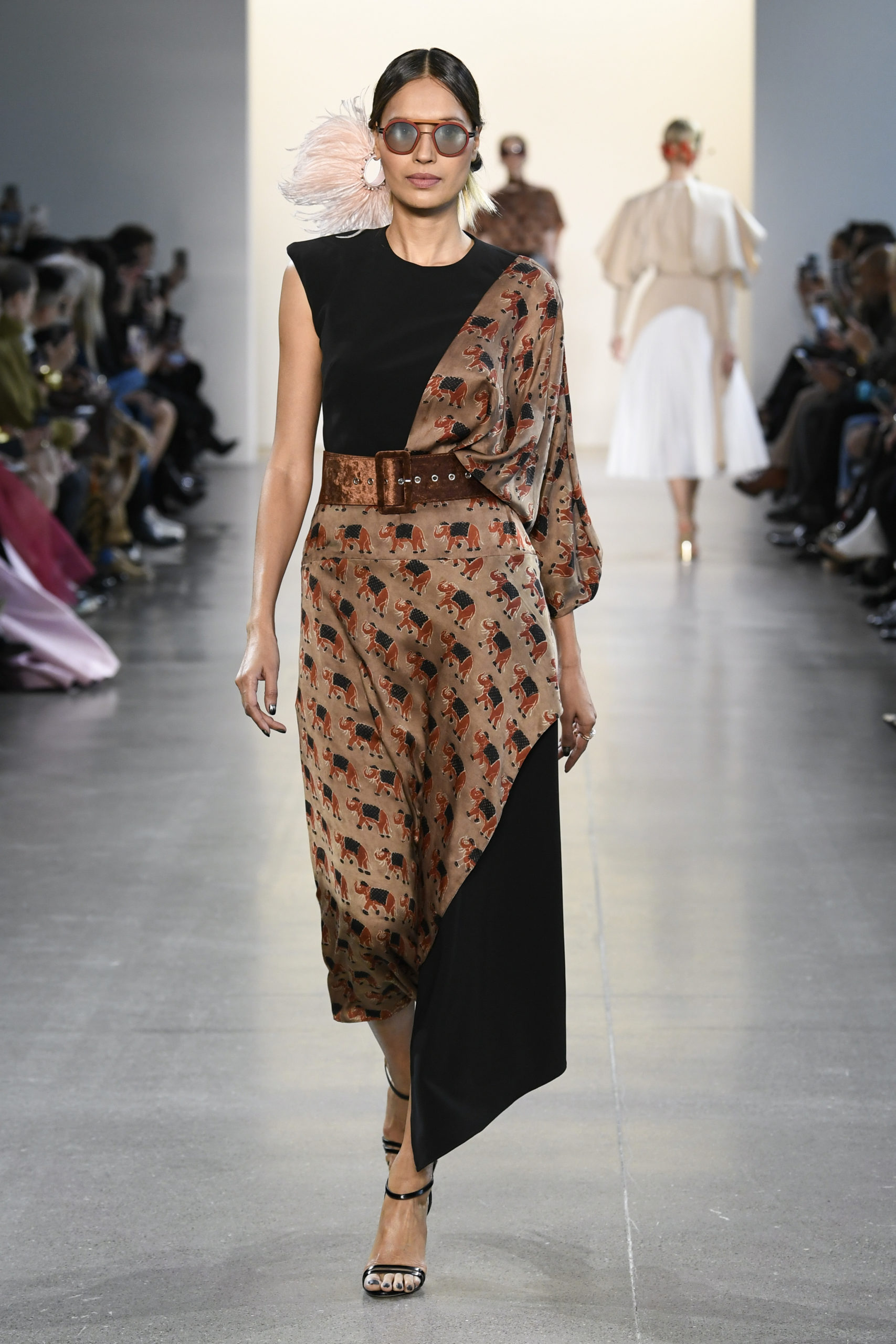 Many of the looks are accessorized with colorful oversized feather pieces, which Mohapatra created with close friend and luxury jewelry designer Ranjana Khan.