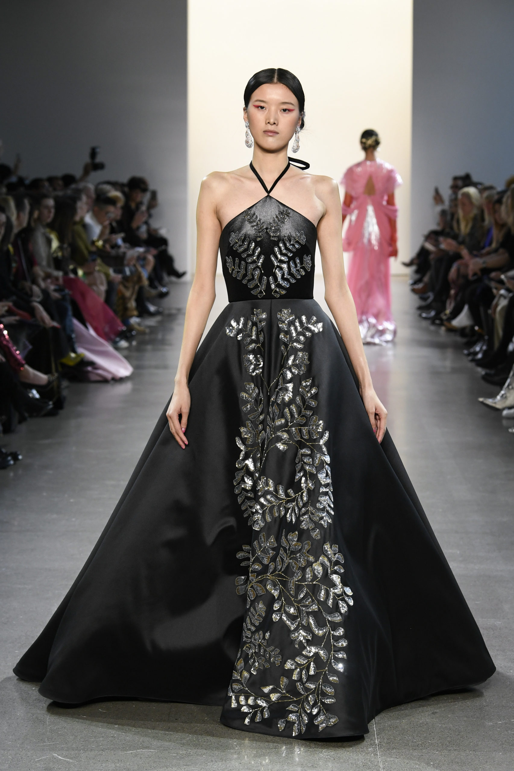 He also experiments with the bold colors of his homeland, featuring bright Jaipur pink gowns heavily embellished with silver embroidery and a stark high-necked long-sleeved gown in an eye-popping shade of sindoor, based on the traditional vermilion red or orange-red colored cosmetic powder.