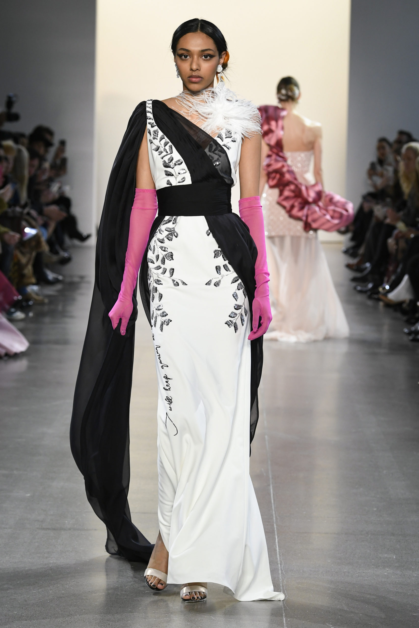 He opened with a fresh take on the banjara dress, featuring an accordion pleated skirt with layers of black, beige and ivory, and ended with a series of gorgeous gowns incorporating traditional Indian embroidery in tree of life or cloud patterns.