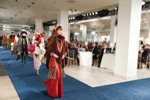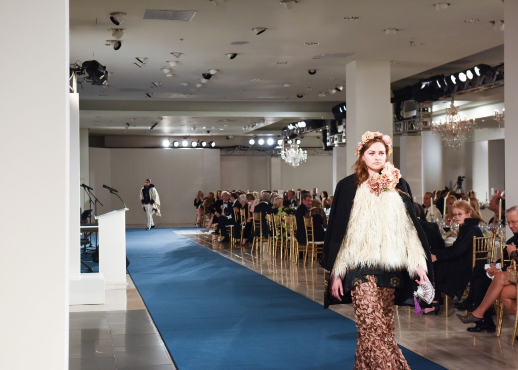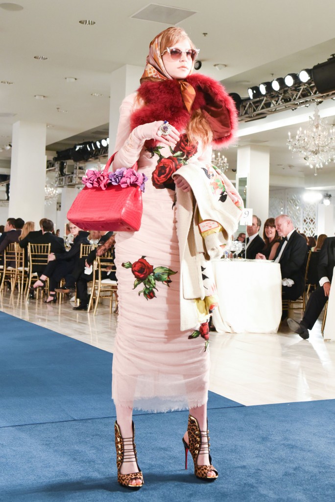 Last night, those cryptic social-media snaps made perfect sense. After cocktail hour in the Shoe Salon, hundreds of the city’s finest rode the escalator to the Couture Salon, which had indeed been cleared of its typical fixtures and set for dinner, with long dining tables and a plum-hued carpet that wrapped around the massive room. That carpet served as the runway for mastermind Downing’s major moment: a fashion show, naturally, which lasted close to 45 minutes, with 50 different models in 50 out-of-this-world fabulous looks. (It took each model close to 60 seconds to make the full catwalk circle from start to finish.)