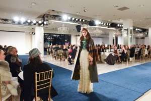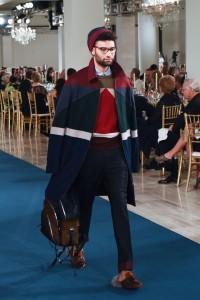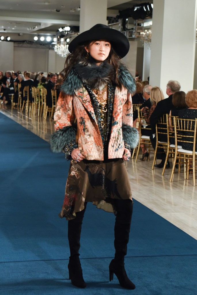 Downing, a senior vice president and the fashion director for NM, is famous for advocating a certain rule: More is more, and less is a bore. Indeed, this was his time to shine. Look after look hit the runway, offering a blatant, brilliant lesson in extravagant layering. Fur ensembles of all kind were everywhere; avant-garde headpieces and jewelry were molded just for the show by L.A. designer Devon Leigh in precious metals and stones; a bare-breasted gent was seductive in a tuxedo jacket and fur-lined slippers; a headscarf-wearing female model appeared aloof in a style that was quintessentially Grey Gardens; and the crowning jewel, perhaps a nod to the upcoming holidays, was the final look: a regal, green gown from Roberto Cavalli, accessorized with a matching emerald-fur stole and a jeweled red clutch.