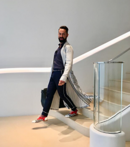 Needless to say, we have been quite taken with his Instagram postings during his European fashion jaunt. The Egyptian-born Armanious has taken Paris by storm, breaking all the stuffy Parisian fashion rules by wearing a canary yellow suit by Jill Sander, an ankle-length fringed jacket by Vivienne Westwood, and YSL floral slacks in red and white combined with red socks and Fendi slippers.