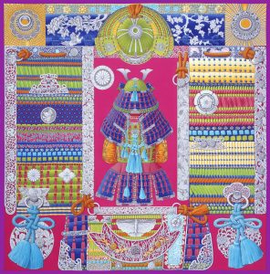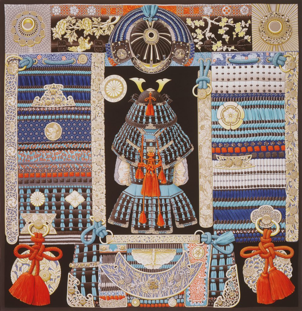 At the center of the scarf is a beautiful suit of armor. This ensemble is not the result of a brilliant imagination. Rather, it is an illustrated replica of one of the many Edo-period garments in stunning bronze, iron, gold, leather, silk, and lacquer from the private collection of samurai armor assembled by Dallas art collectors Ann & Gabriel Barbier-Mueller.