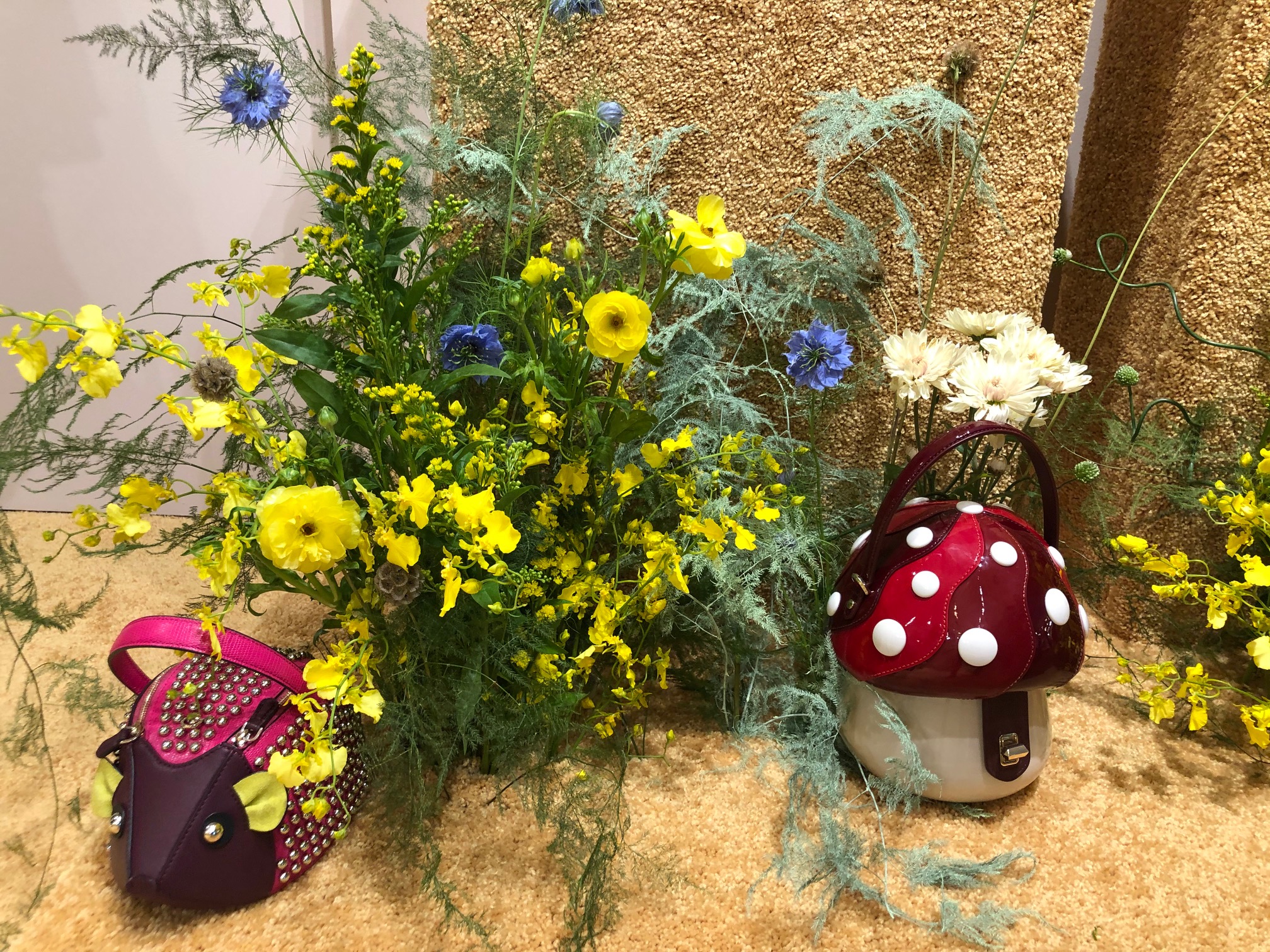 Also on display were sparkly mushroom-shaped rings, oversize brooches shaped like the brand’s spade logo, and top-handle handbags stitched with crocheted garden scenes.