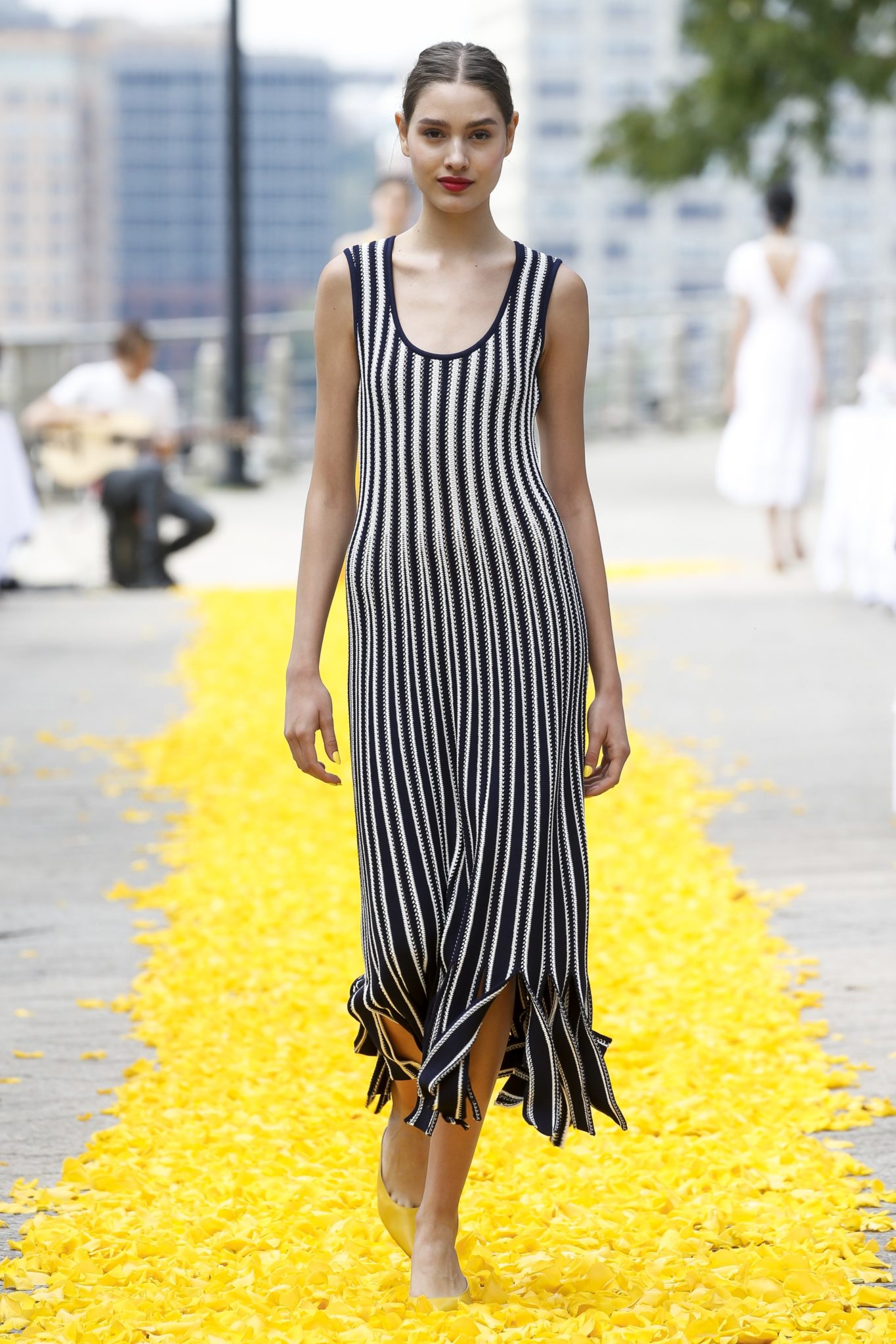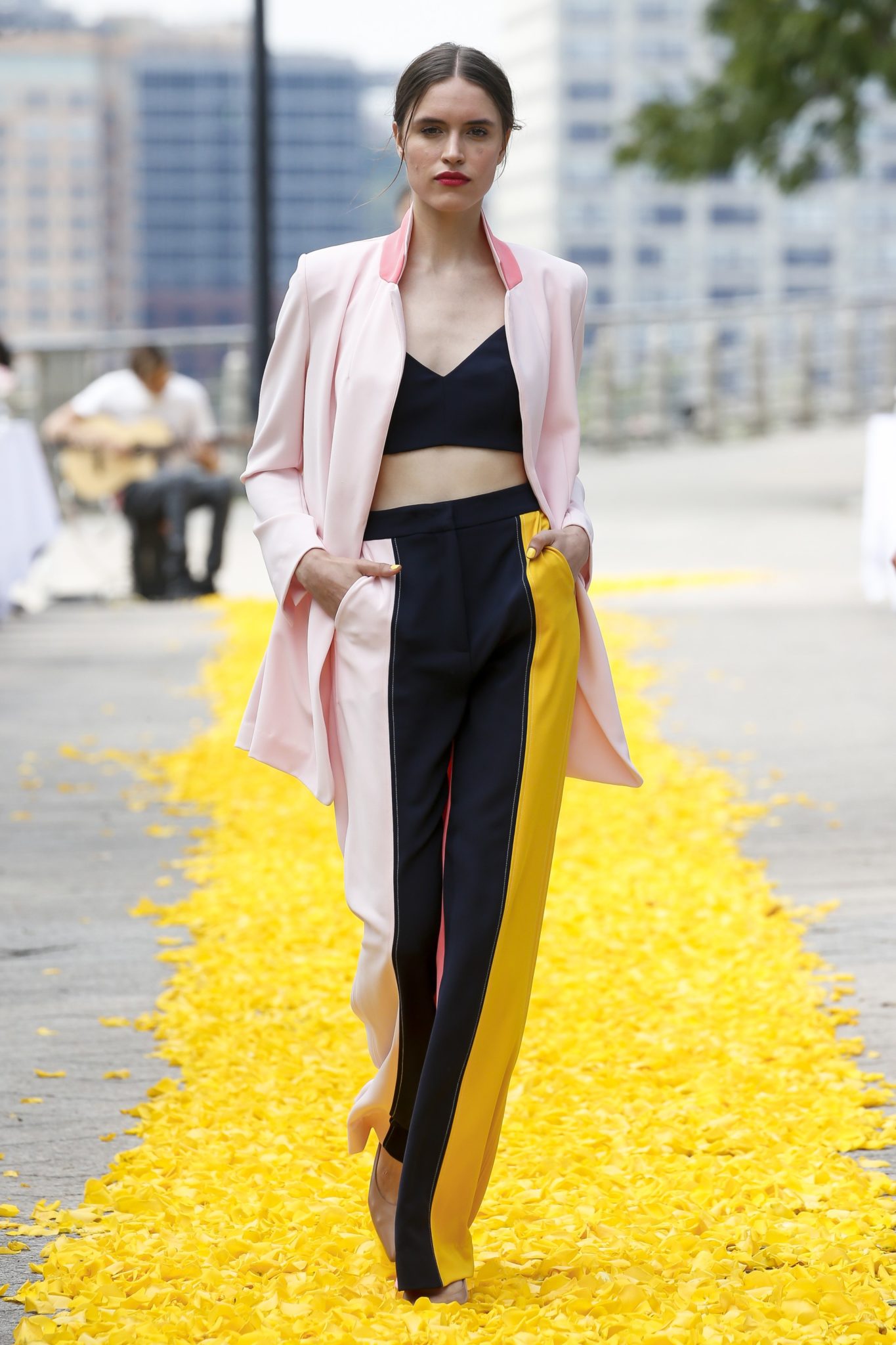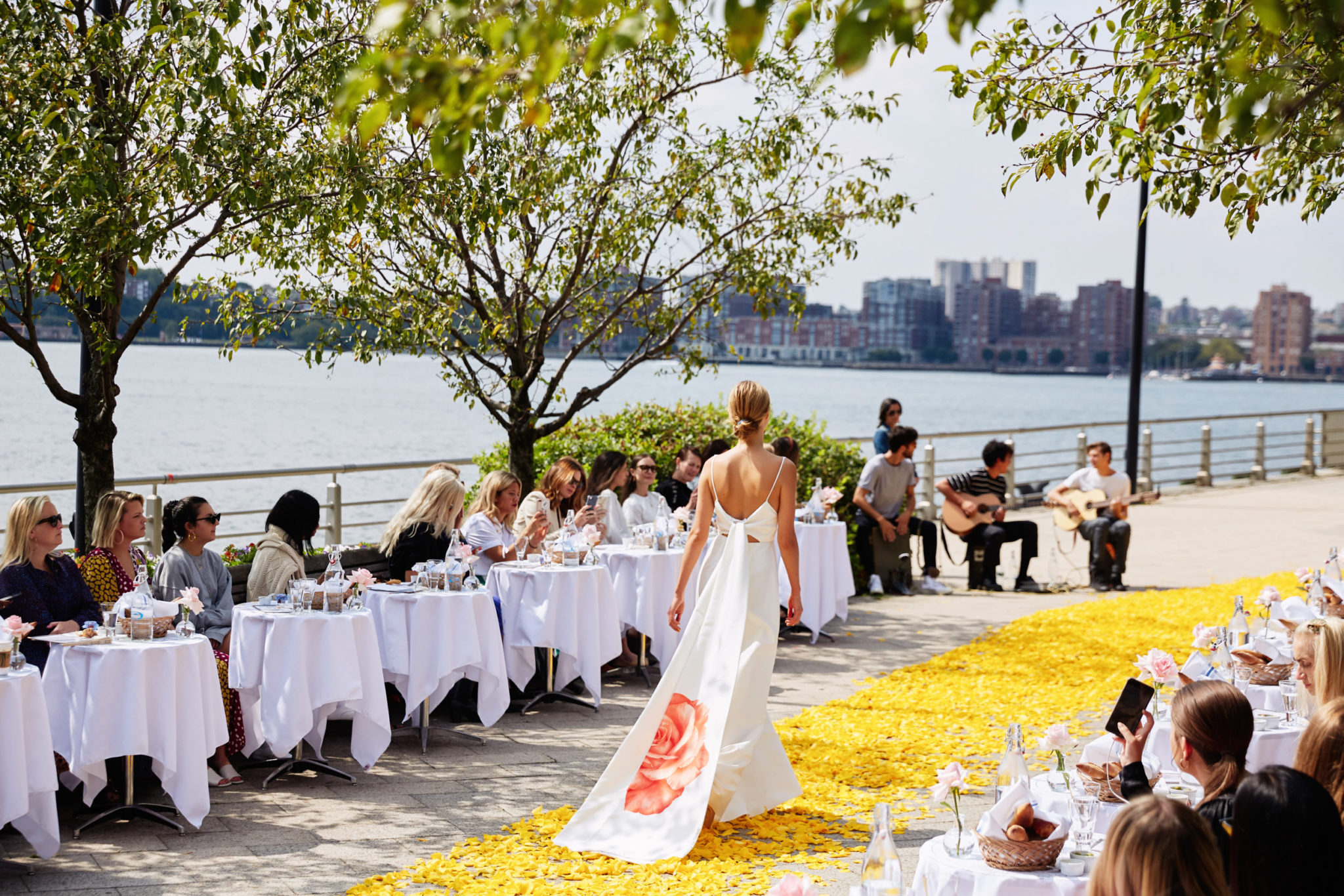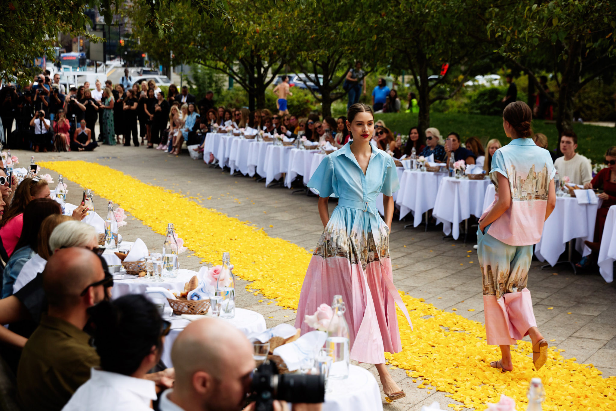 Invitees sat in groups of two at small round tables covered with crisp white tablecloths and laden with baguettes, croissants and other freshly baked breads, that lined a long sidewalk, where hundreds of rose petals were scattered to create a runway. The designer dubbed it her “yellow brick rose.” A three-piece band played light music as models strolled along the runway on the picture-perfect day.
