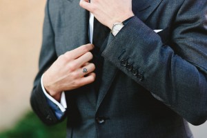 Bridal Bling: Platinum and diamond eternity band (hers), Briolette morganite drop earrings with diamonds (wedding), pear-shaped morganite earrings with diamond pavé (reception), titanium wedding band (his), all from William Noble Rare Jewels; engagement ring by Jennifer Meyer.