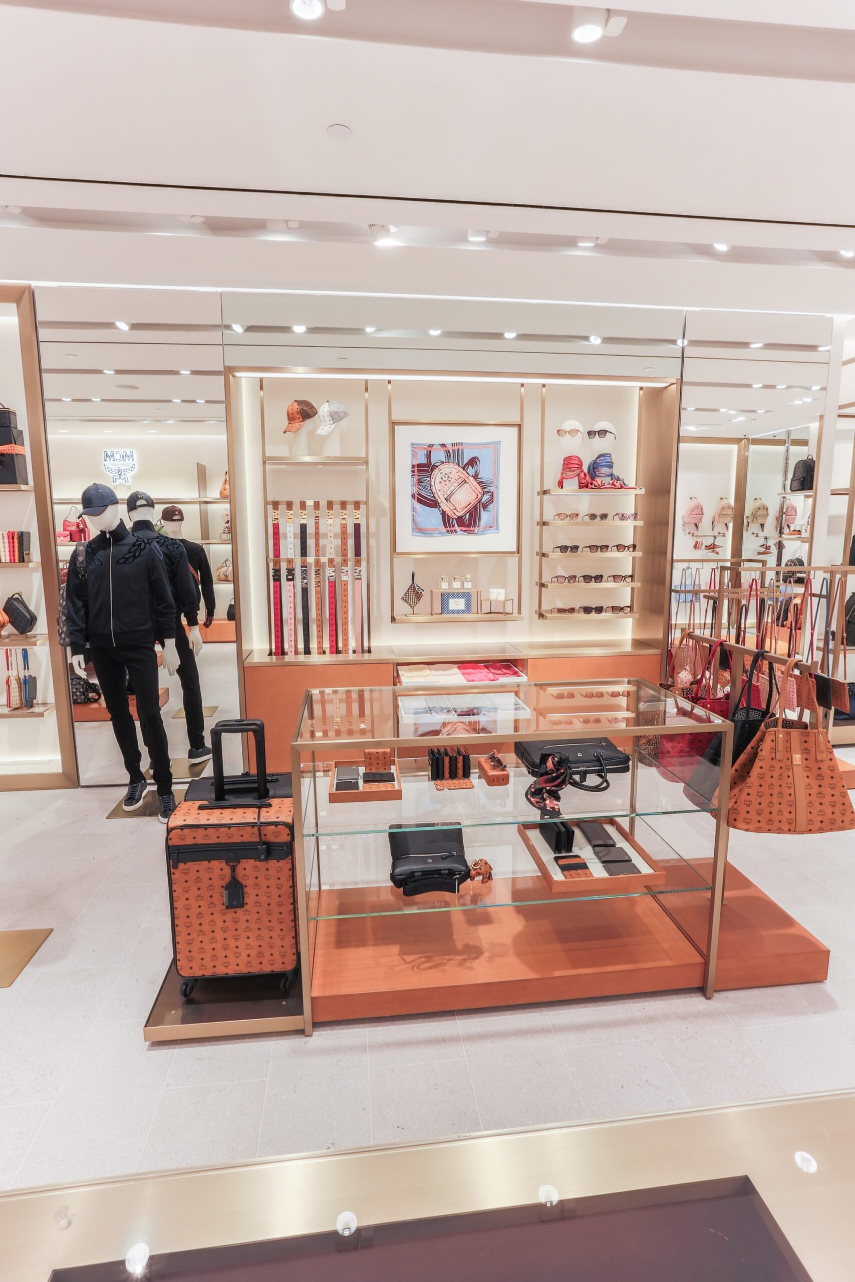 MCM’s offerings pop against the neutral palette of the Dallas store, which also features gray stone floors, custom lighting, warm brass tones, and gold metallic accents.