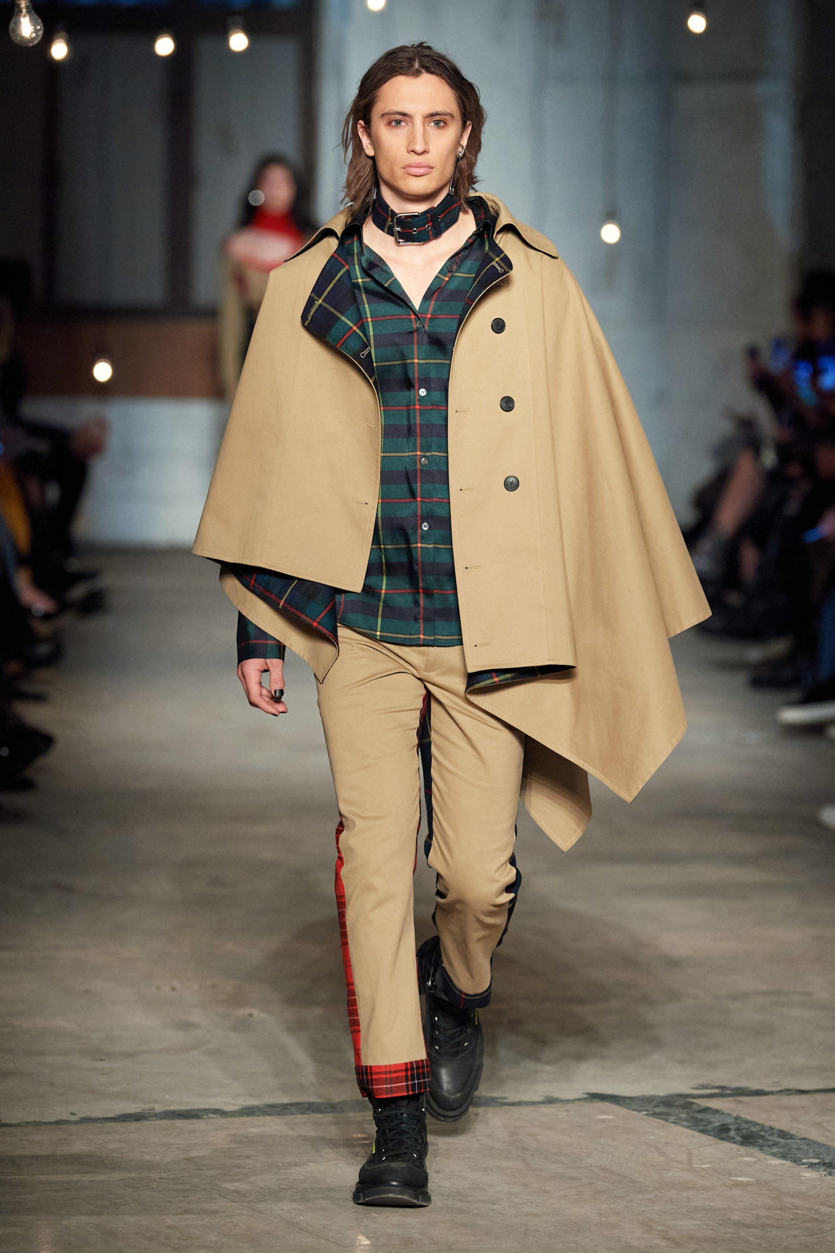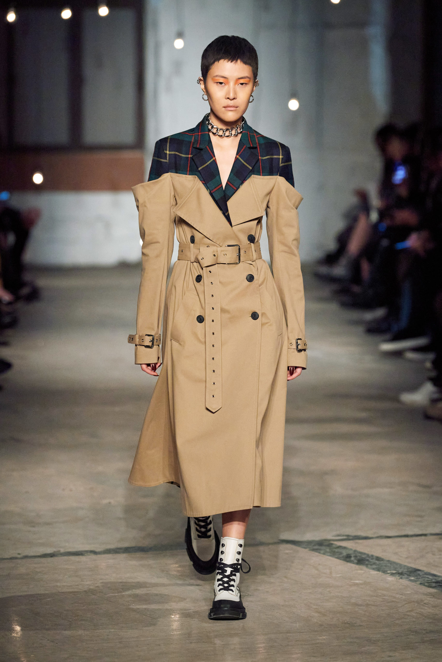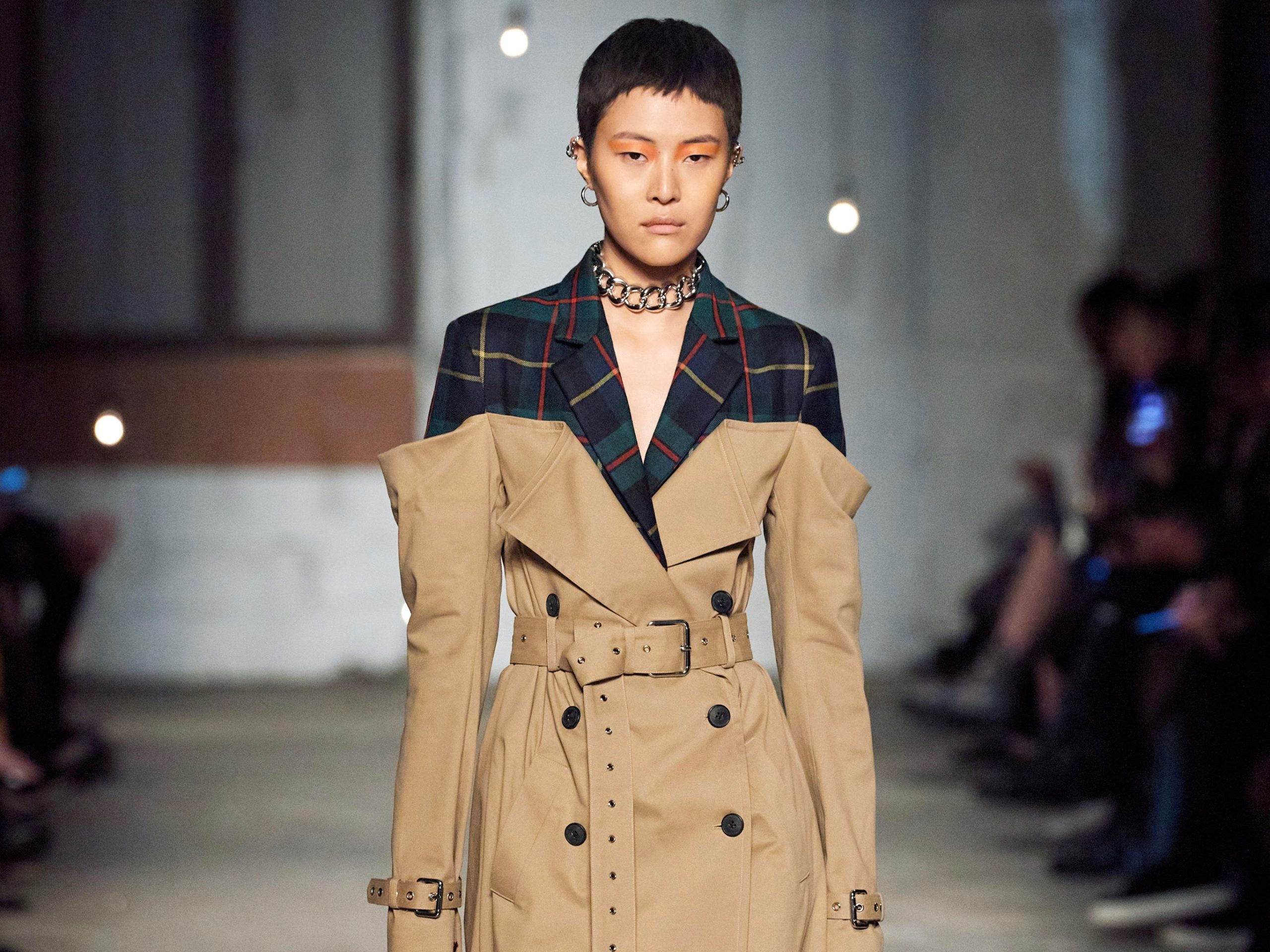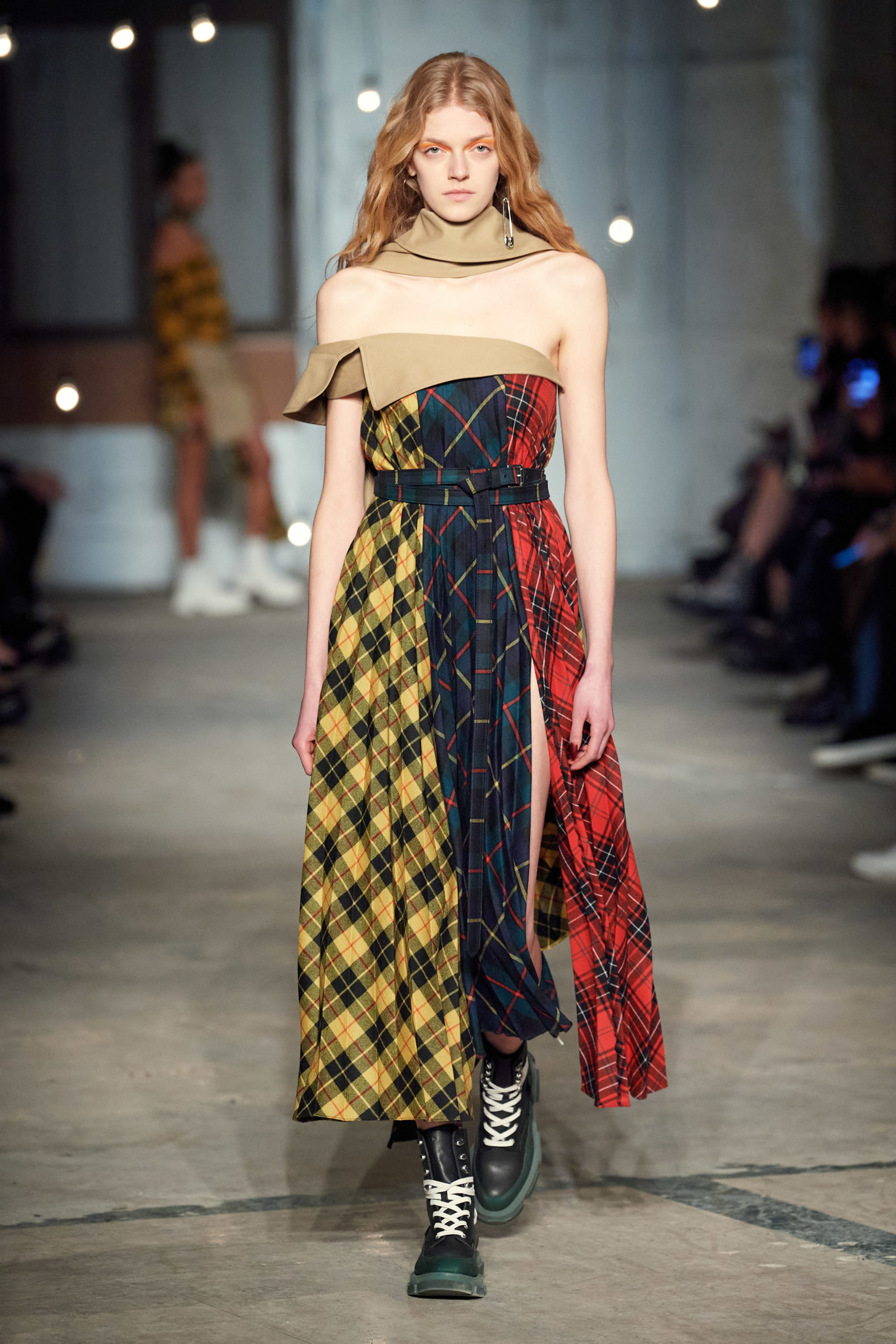 For fall ’20, they returned to the runway with a Monse collection that’s got attitude. The design duo channel a rebellious spirit with multiple tartan plaid dresses — long and short, with jagged hemlines or sewn right onto a deconstructed khaki trench. Other inspired standouts include a skirt fashioned from a moto leather jacket, a trench coat with plaid shoulders, and an “upside down” trouser in patchwork herringbone.