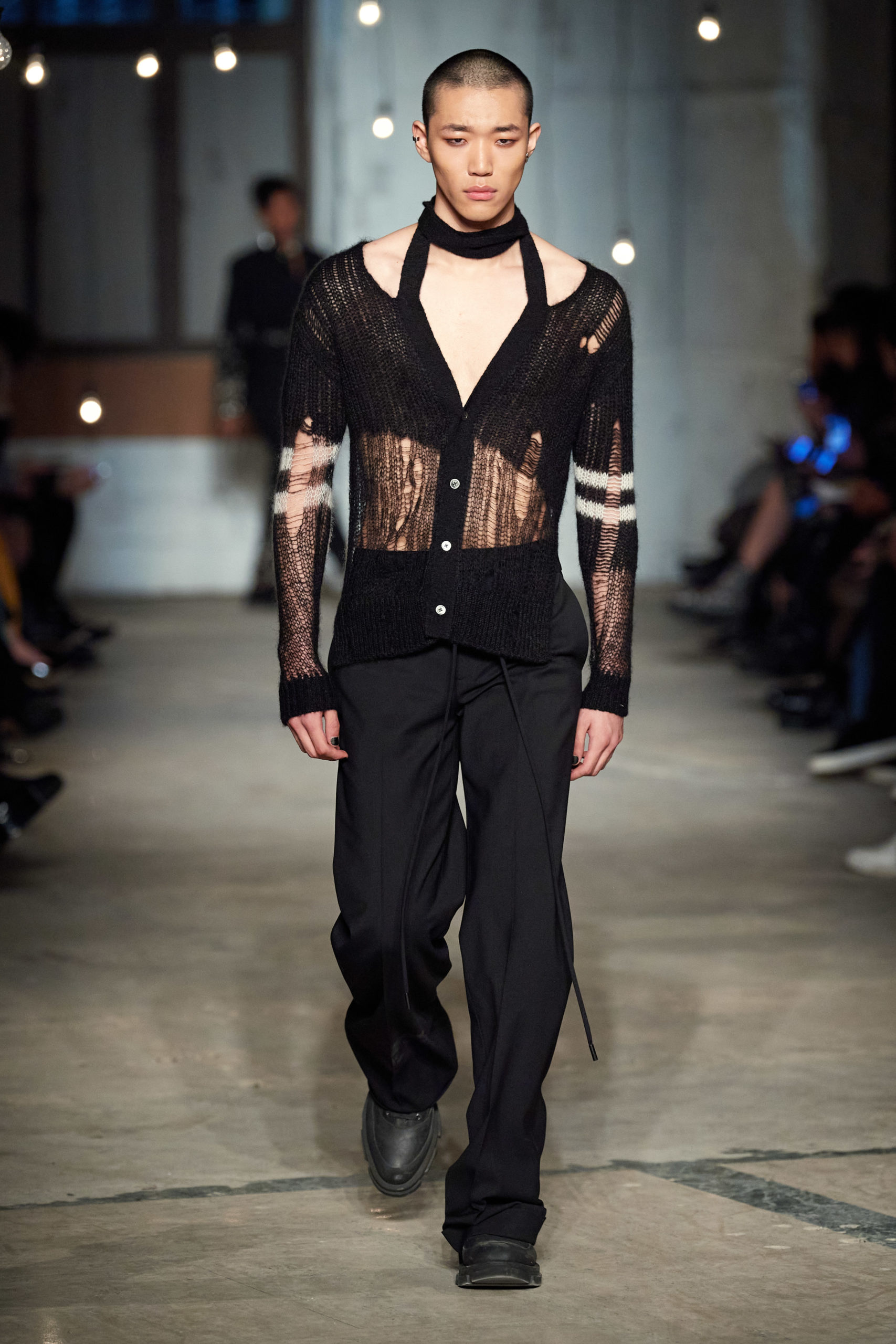 Sweaters also had a fractured slant, with Fair Isle turtlenecks turned inside out, cheetah print cardigans, and knits with a kidney bean-shaped cutout at the collar bone.