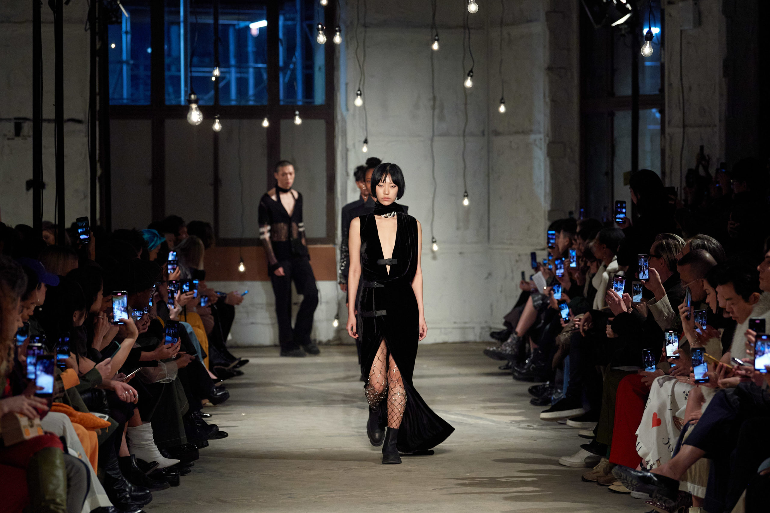The venue — a tony Wall Street space stripped down to the concrete walls with no heat — enhanced the experience. The fashion crowd kept their coats, hats and gloves on but still shivered while waiting for the show to start. Outside, protestors were banging on drums and blowing whistles to protest the new landlord’s drastic cuts in salary and medical benefits for employees.