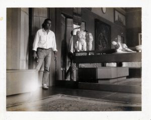 When shooting with his old Nikon, Guy would expose a roll of Polachrome first to check lighting and exposure prior to shooting a roll of Ektachrome. Bacon arrived. Guy posed him in front of one of his paintings and exposed the Polachrome. I developed the film in the hand-cranked box that processed the film. This takes several minutes, and once it was finished, Guy took a quick look and started shooting with the Ektachrome. I’m sure Guy intended to shoot three or four rolls of film, but after just 36 frames, Bacon stood up and said, “That’s enough.”