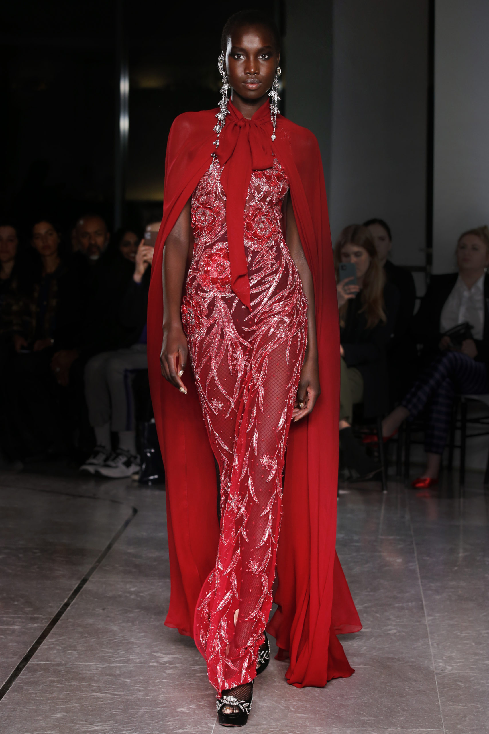 For the second season in a row, Khan showed his collection in the lobby of his ultra-modern apartment building, designed by noted architect Zaha Hadid before her death in 2016. He added a live band, which played easy listening hits as models roamed about during the runway show. On the front row was his good pal, Ryan Seacrest, who is a regular fixture at Khan’s shows.