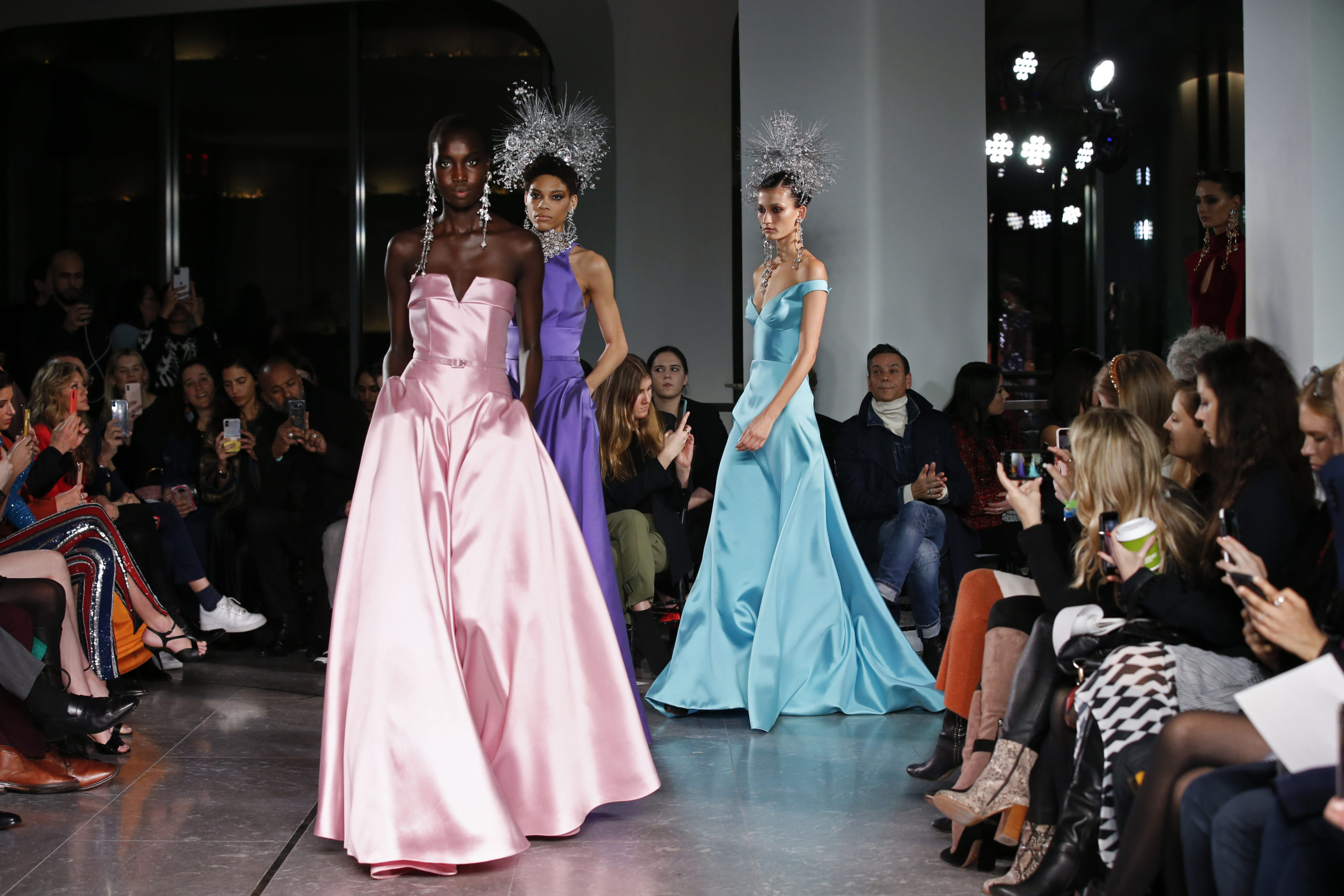 Other all-American looks in Kahn’s fall collection, which was unveiled at New York Fashion Week, include a slinky hooded gown and evening pajamas in a blue-and-silver sequined star pattern. Toward the end, a number of pastel satin gowns were accessorized with oversized Statue of Liberty-inspired crowns, created by jewelry designer David Mandel.