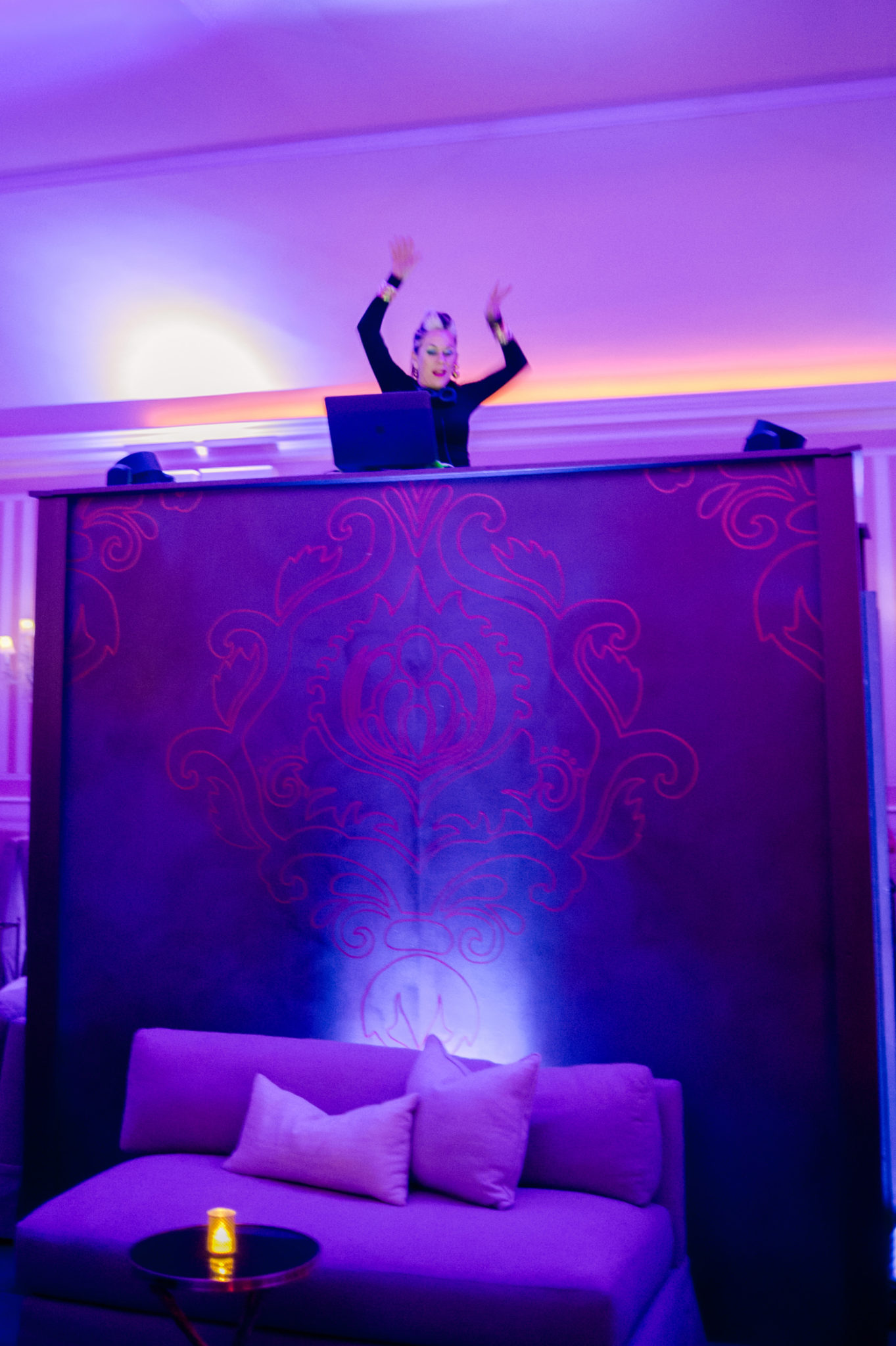 Guests made their way back inside to the ballroom, which had been closed off all night for the surprise after party (don’t worry, the newlyweds circled back to join in on the fun). In the center of the room was DJ Lucy Wrubel, perched atop an eight-foot-tall podium.