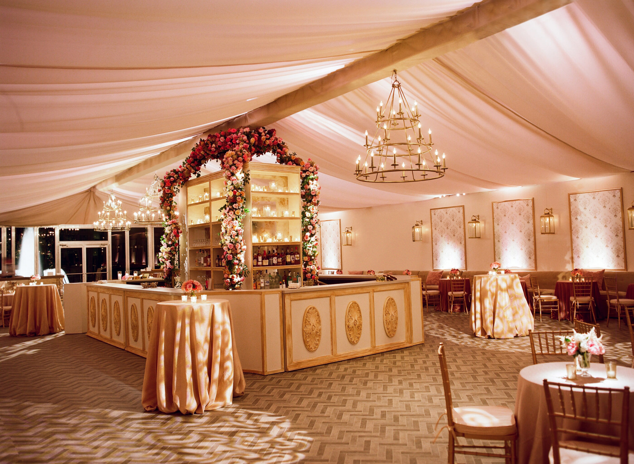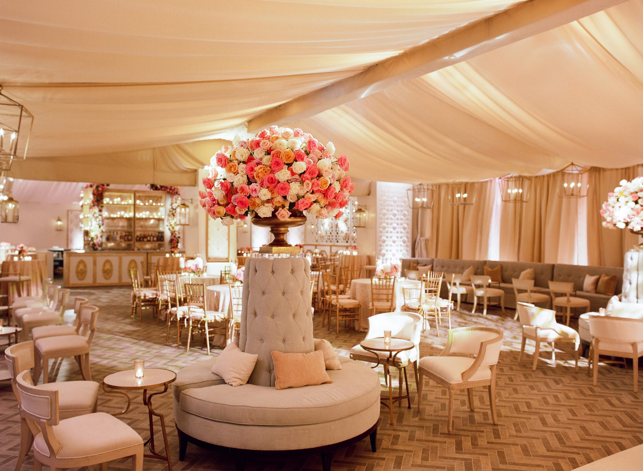 The couple’s guests had the same reaction when handed their own cocktails at the door, and the delightful surprise was just beginning. Egan and team had completely transformed the elegant, 1954 venue, and constructed a breathtaking tent to serve as the main reception space.