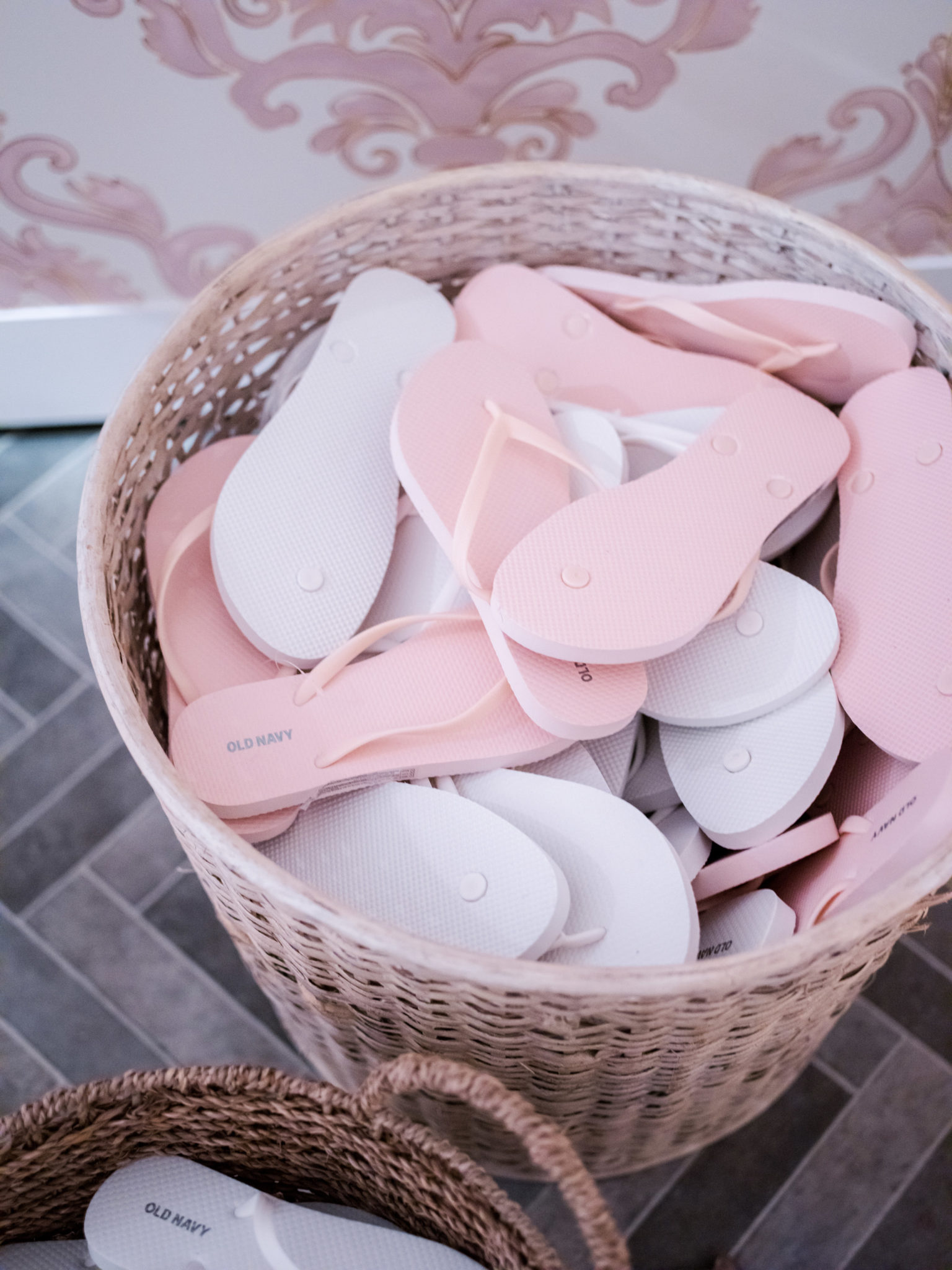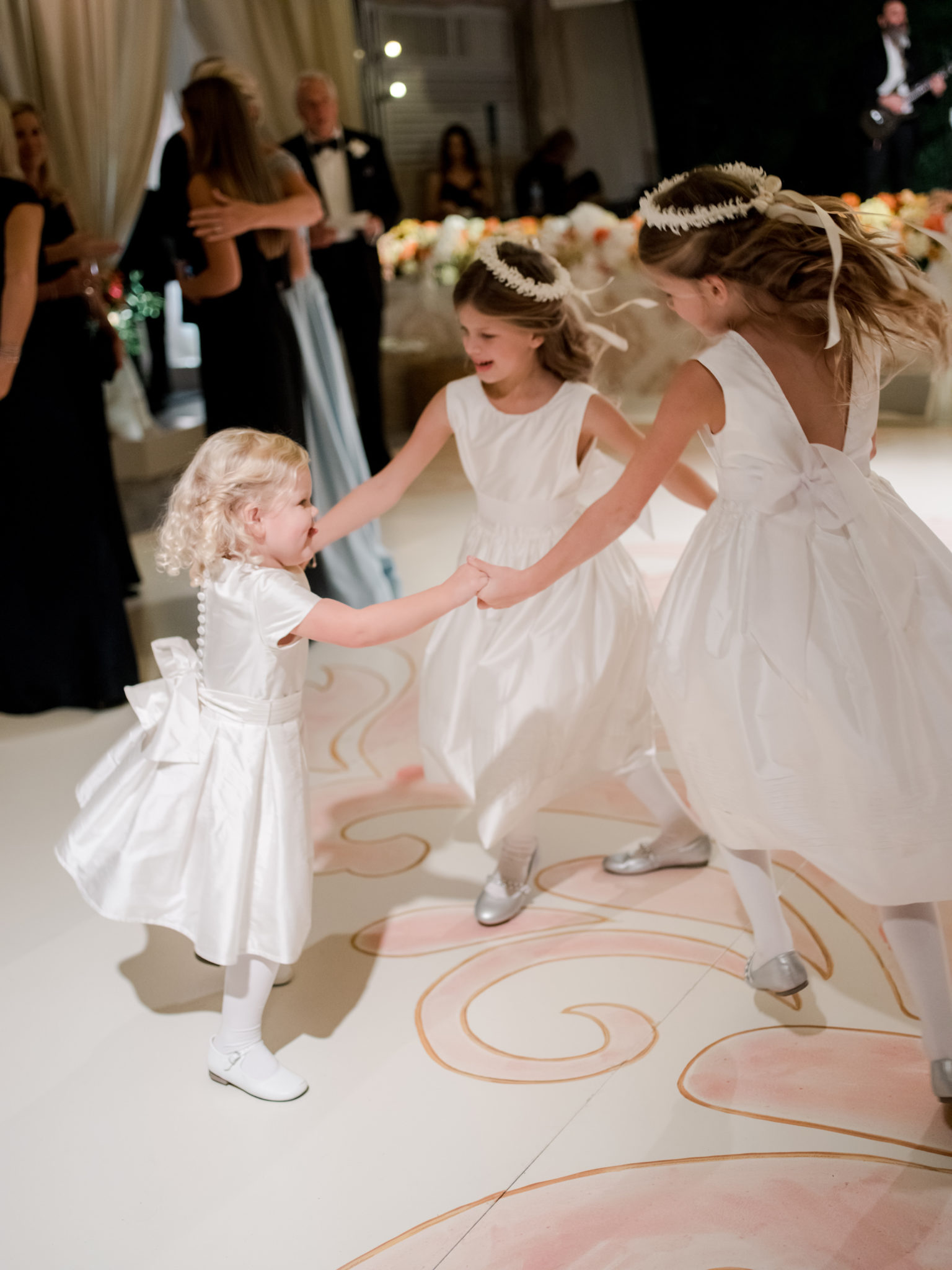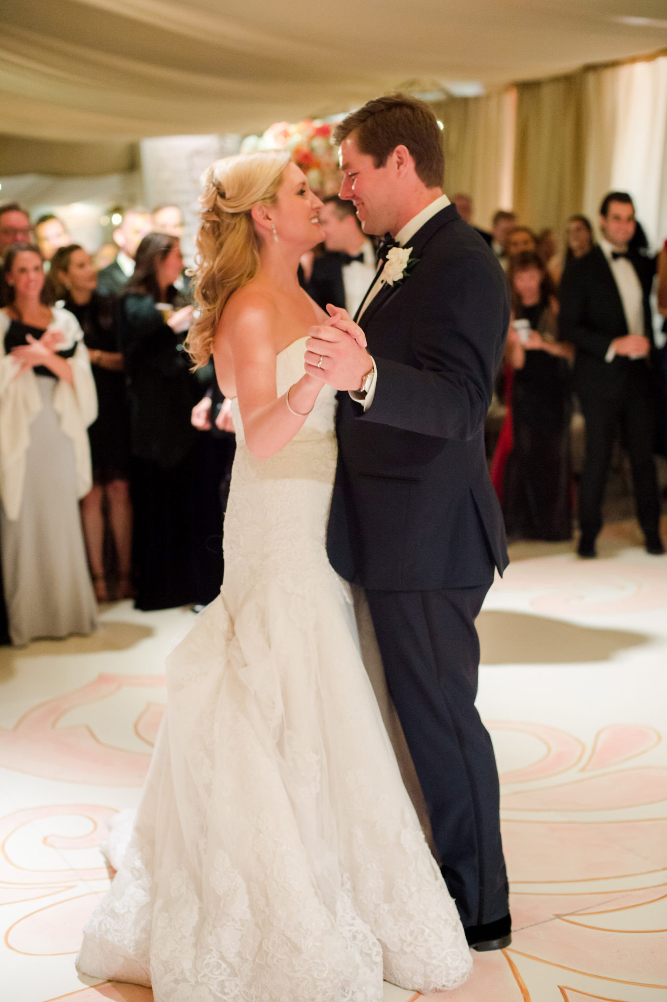 The custom damask motif from the invitations, designed by Dallas’ Alyssa Reeves, served as a design element throughout. The design showed up as a tight, residential-wallpaper-style print on tent walls and was blown-up and hand-painted in pale pink on the dance floor, with a stunning chandelier of hanging orchids overhead.
