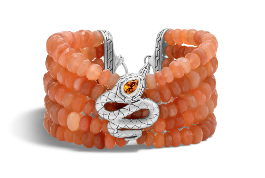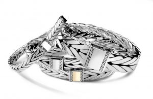 The artisan-made collections are crafted with 100 percent certified recycled gold and silver. Poetic bead bracelets in ruby, lapis, malachite, and moonstone symbolize power and strength; Legends Cobra, Macan, and Naga collections represent mythical talismans, and new is the woven gold and silver Modern Chain collection, inspired by a men’s bracelet first produced in 1992 and requiring the work of at least five artists and 15 hours to create.