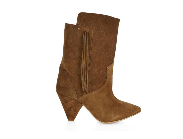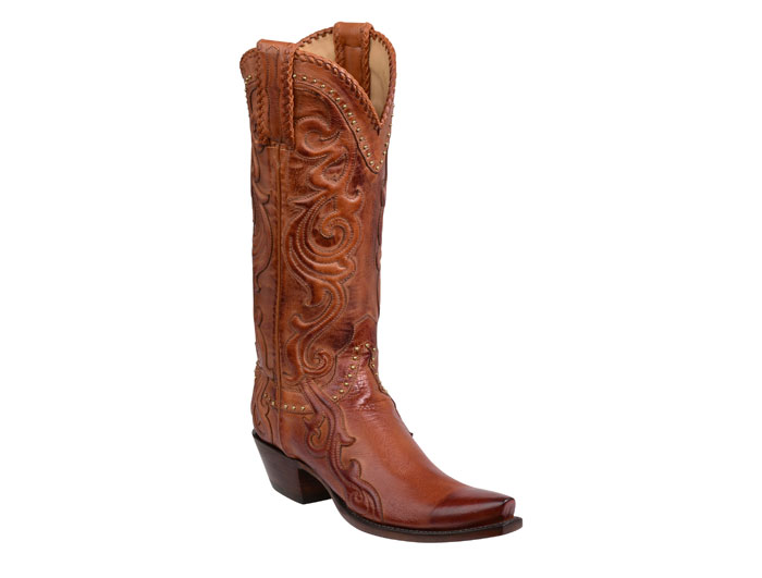 You don’t have to wear a cowboy hat to master the look. An easy option for showing authentic style is by adding a touch of suede to your ensemble; opt for a suede fringe skirt if you’re ready to own it, or don a pair of camel-colored booties that will transition perfectly into your everyday wardrobe. The Lucchese Saratoga boot is the ultimate fashion-lover’s cowgirl boot, with its soft leather and feminine detailing of golden studs, hand-braided collar and French scroll overlay.