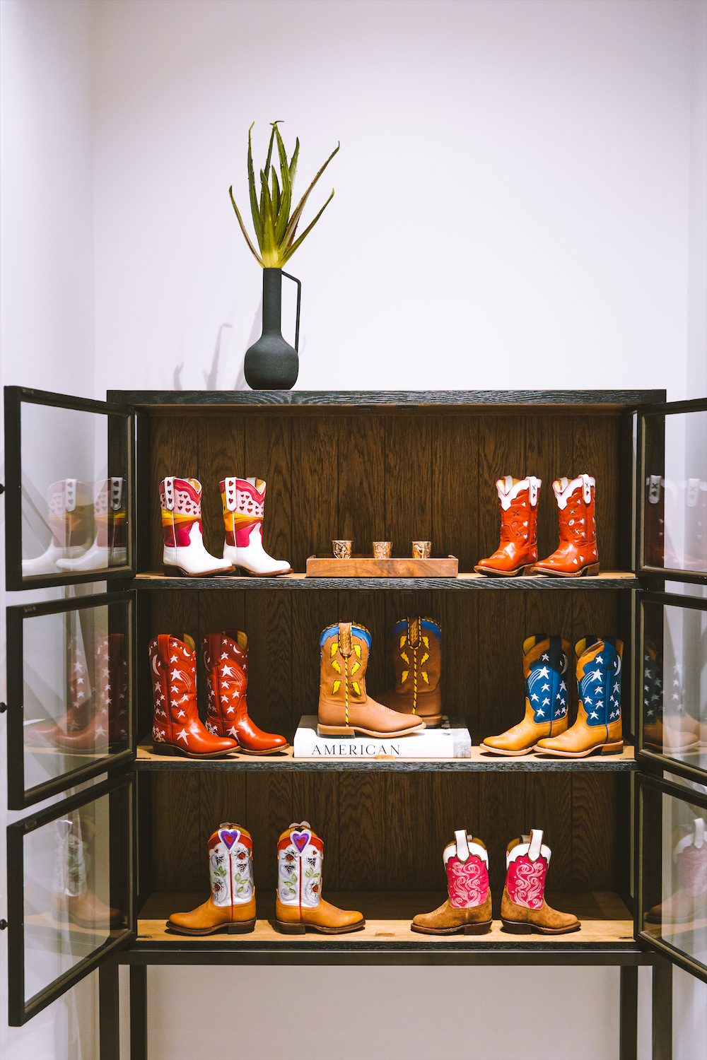 Dallas’ finest, contractor Gill Brown of Maplewood and designer Javier Burkle of Burkle Creative are dear friends and partnered to reimagine every inch of the space in a way we could never have dreamed. Blank white walls with specialty arches, cozy grey wood floors, and terracotta-hued textiles and tiles are the perfect canvas for our cowboy boot collection. The space really feels like a continuation of our Dallas studio.