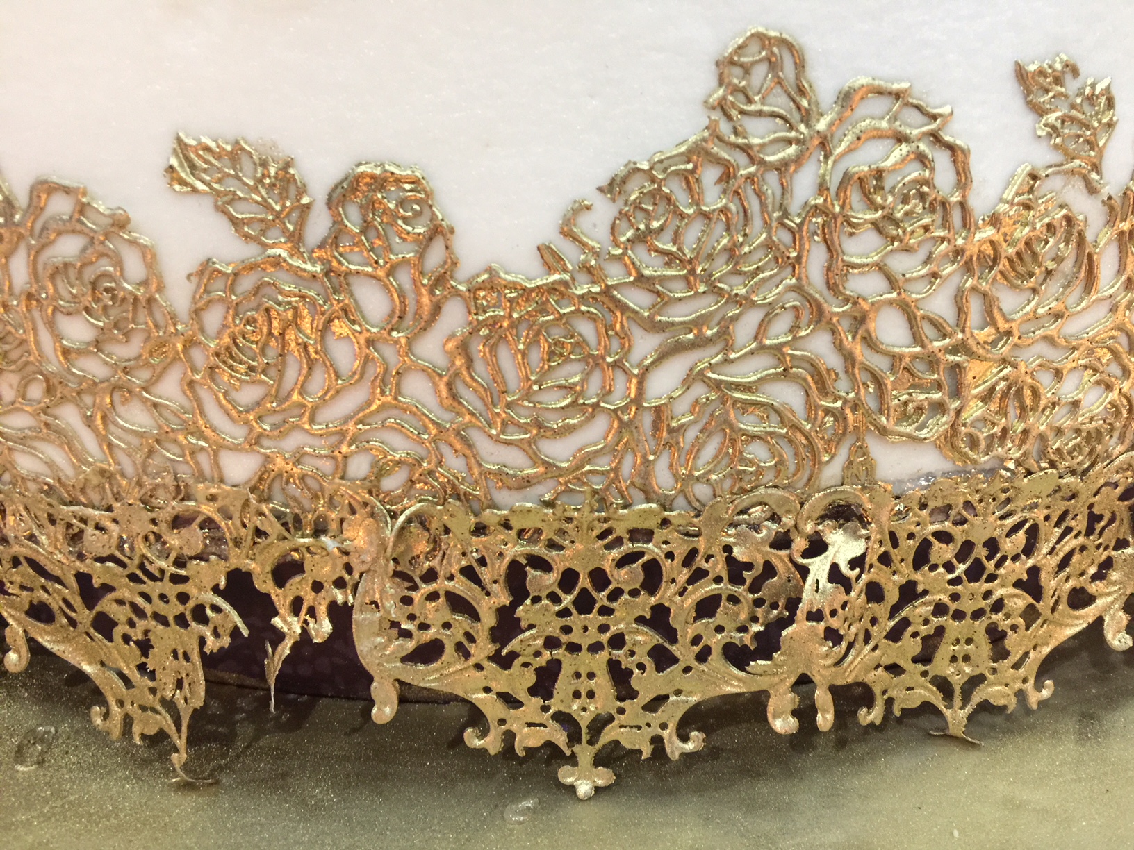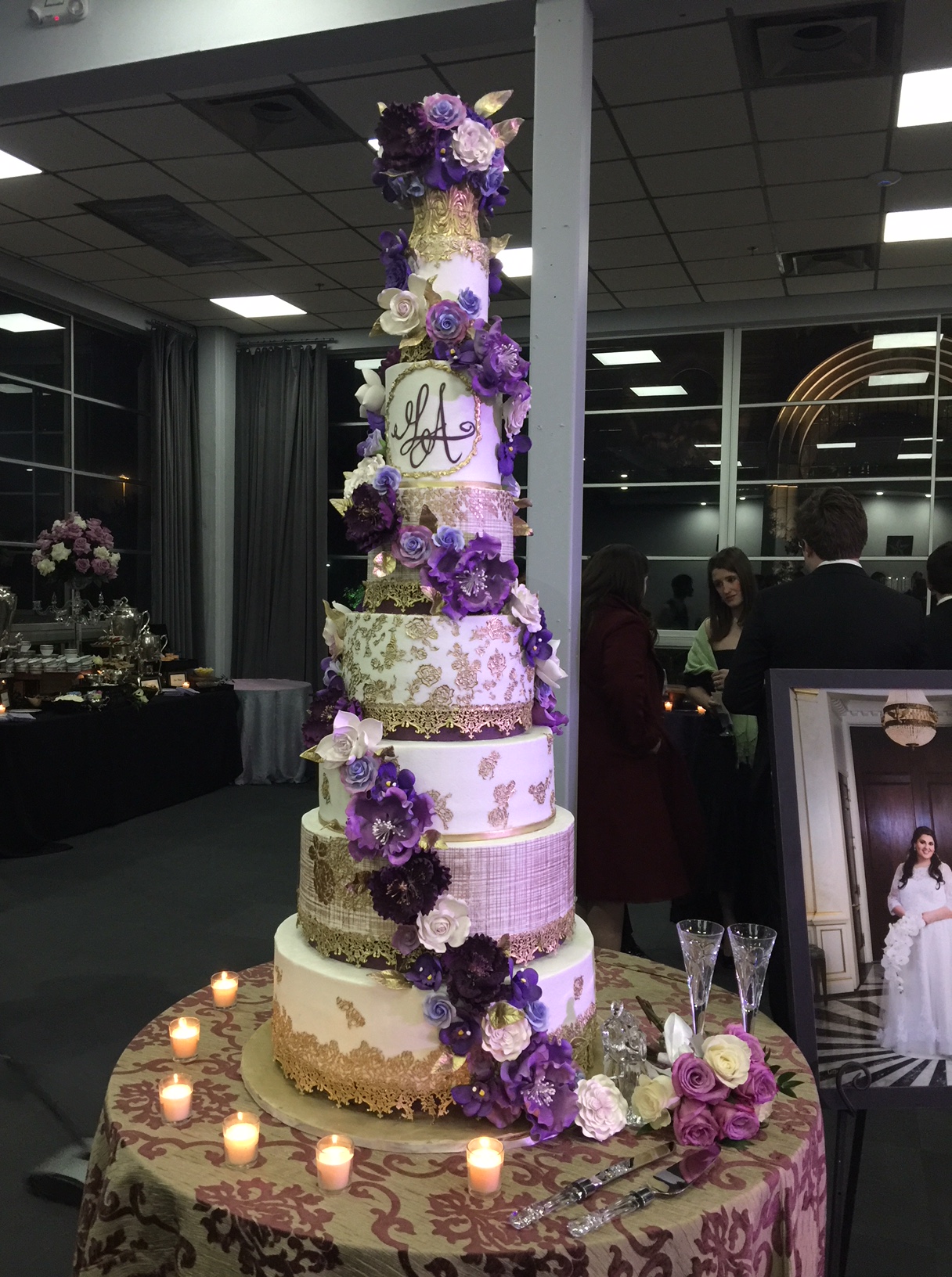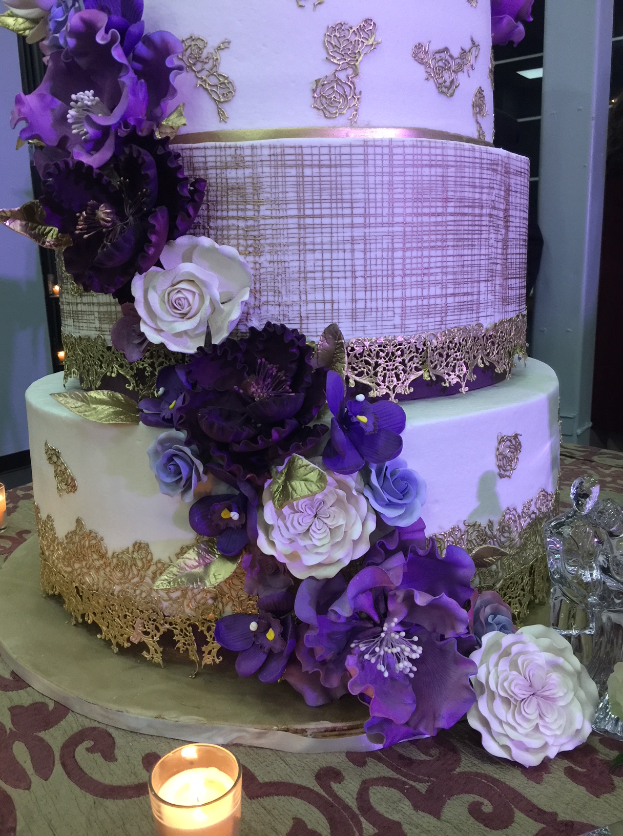 Taking cues from the couple’s marsala- and gold-hued invitation, Moon created a scrumptious “divine white” cake with amoretto butter cream filling in a decorative motif that mimicked the golden lace on the invitation. She ordered special molds for the lace, made from sugar and painted in edible gold dust. Trails of life-sized edible roses, peonies and orchids in varying shades of purple circled the towering wedding cake. “It was so regal and so beautiful, just perfect for the princess bride,” Moon said.