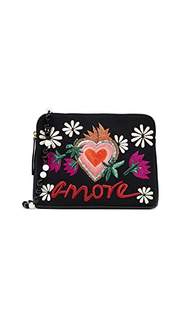 For those wanting to wear their hearts on their sleeves, a celebratory ensemble for the occasion can be complete with a heart printed dress, bright colored spectacles or an amoré themed handbag. Why give a greeting card when you can send your message on a powerfully captioned 100 percent cashmere Lengua Franca sweater?
