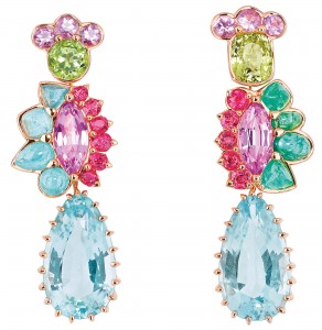 Her Granville collection is an homage to Monsieur Dior himself, inspired by the colorful blooms in his childhood garden and playground in the town of Granville on the Normandy Coast. Green beryl, peridot, aquamarine, tanzanite, chrysoberyl, pink tourmaline and rubellite pose as orange tulips, blood-red roses, intense violets and sunflowers, offset by rich green foliage — a bouquet that won’t soon fade against the backdrop of the maison’s glorious 70-year history.
