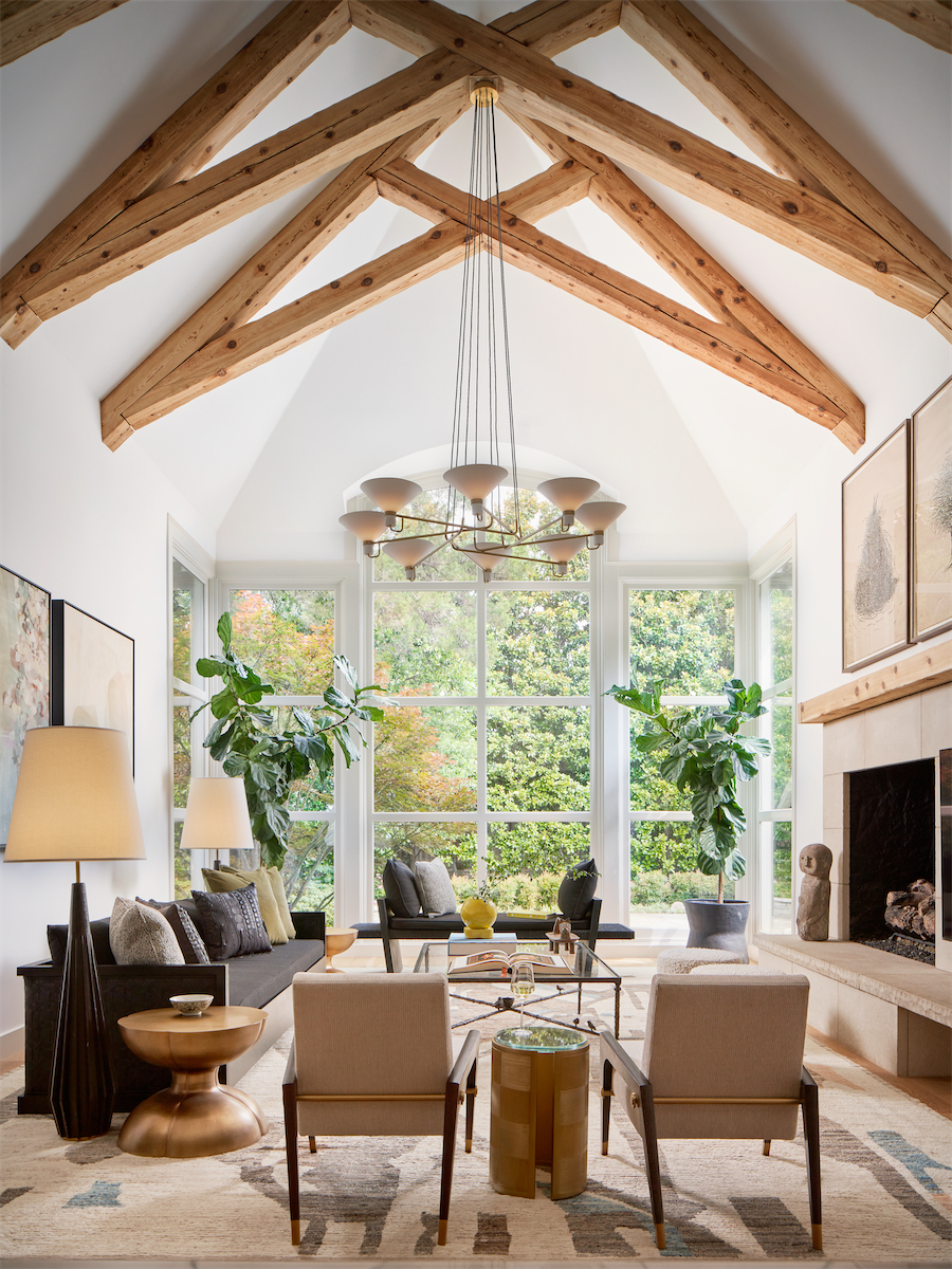 Dilbeck’s original living room — a vaulted bi-level space with staircase leading to a pair of bedrooms — is now being used as a dining area. The owners love to host dinner parties, and a bigger table that seats 12 — set in this show-stopping space — makes a dramatic statement for entertaining. Vanderford designed the table’s black-marble top and brass base to give balance to the high ceilings and timbers, and he replaced the previous ornate iron chandeliers with lighting pendants by Apparatus that almost disappear into the rafters.