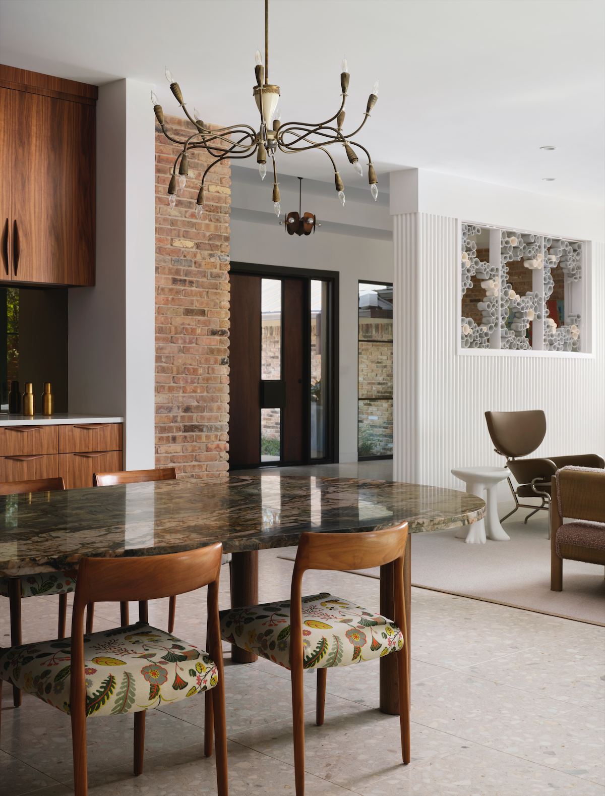 “It’s very inviting, light, and fresh now,” Homsey says. A pair of floating plaster walls with a fluted texture was designed to define the open spaces. In the living room, a plaster wall with a custom Chad Dorsey Design Strike marble fireplace creates two distinct seating areas, while a plaster wall in the entry provides privacy and visual interest.