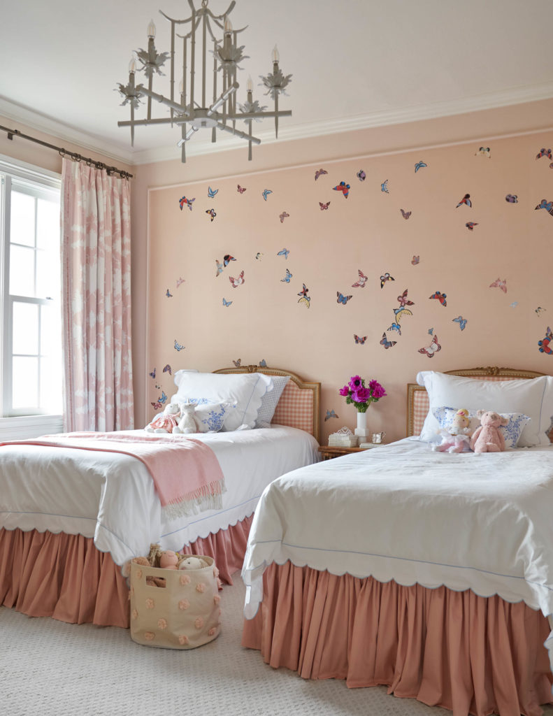 “You had me at de Gournay! Love the whimsical atmosphere of this beautifully detailed girls’ room. The inset wall panels add architectural interest. The mix of patterns and pops of blue accents adds a layered sophistication to this very pretty space.” — Brooke Giannetti