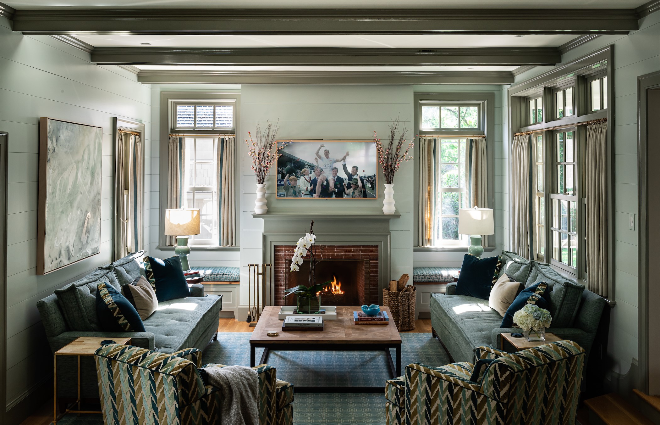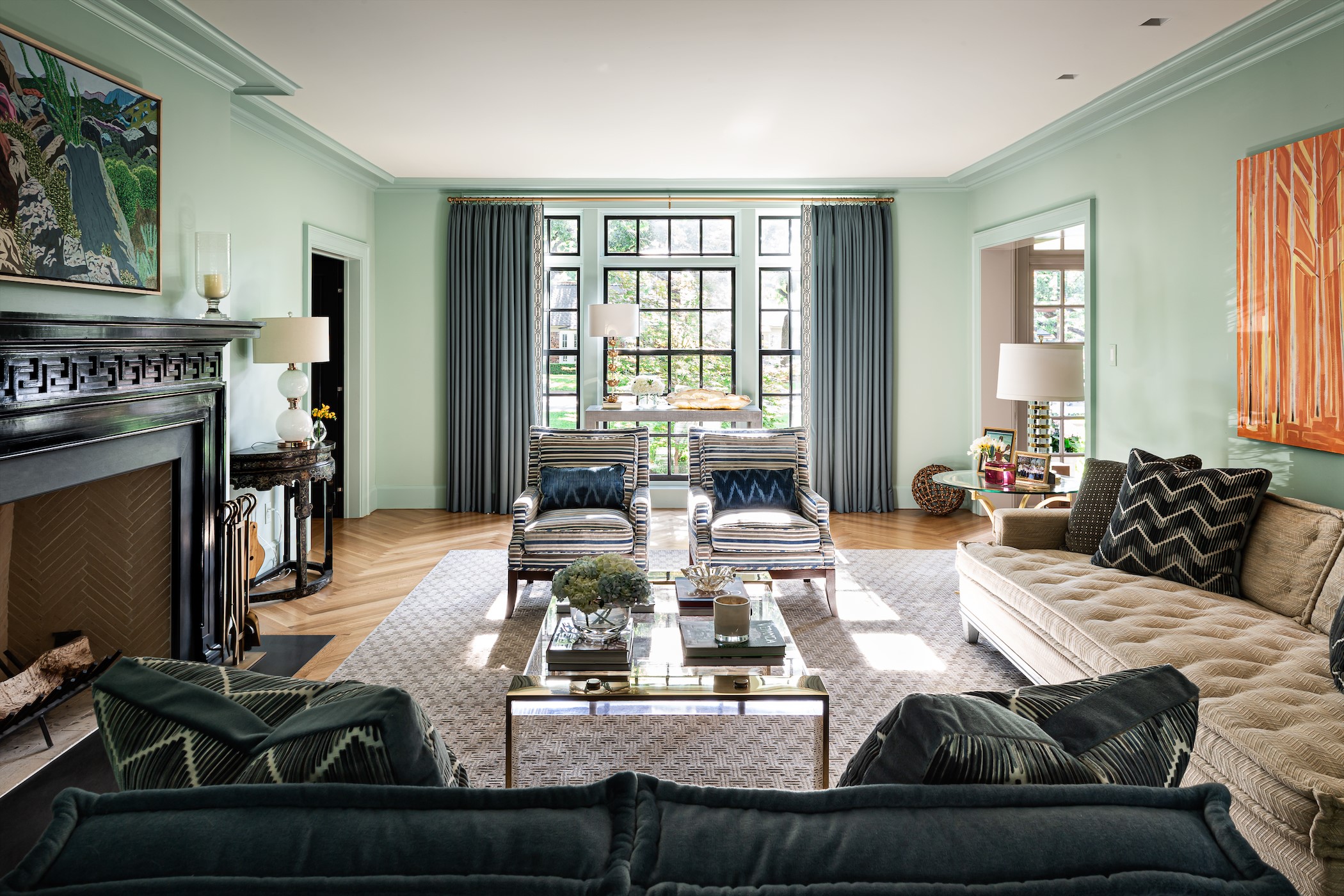 Designer Trish Sheats, a partner in V Interiors, worked closely with the couple on paint colors, light fixtures, tile and stone choices, bath and kitchen fixtures, and furniture. “They wanted it clean-lined but comfortable and warm, with a lot of color that would be timeless. With five young children, they used fabrics that would wear well like mohair, cut velvets, and wool,” she says. Lizzie’s favorite color is blue, so many of the walls are painted in sumptuous shades of Farrow & Ball and Benjamin Moore blues, with hints of greens and grays. They selected elegant but durable fabrics for upholstery and draperies including Coraggio, Kravet, Holland & Sherry, Brunschwig & Fils, and Cowtan & Tout, with trims by Samuel & Sons and Brunschwig & Fils. They kept a handful of family pieces including the ’40s-era dining-room table and chairs that belonged to Lizzie’s grandmother, but most of the furniture was custom-made for each room.