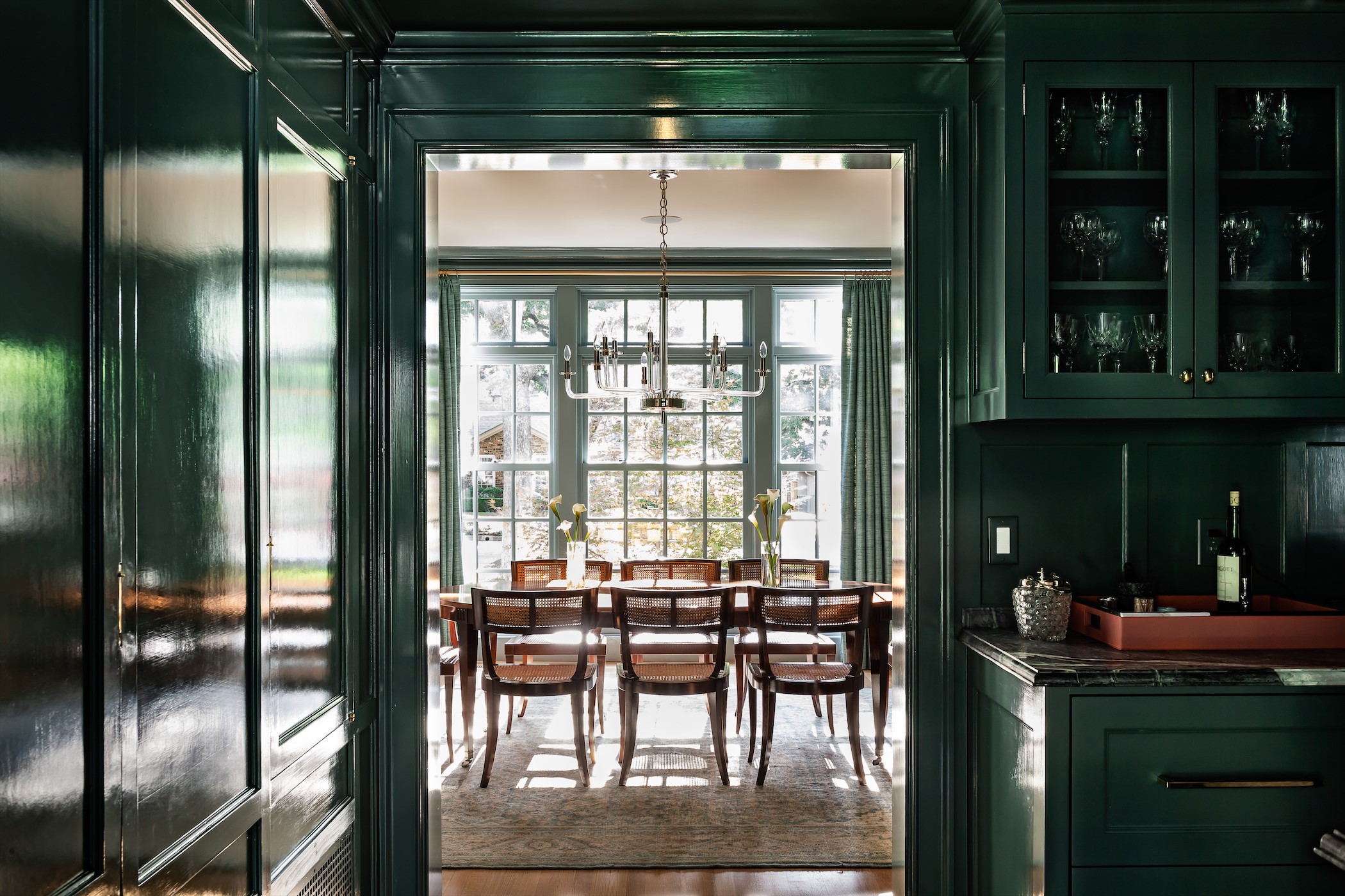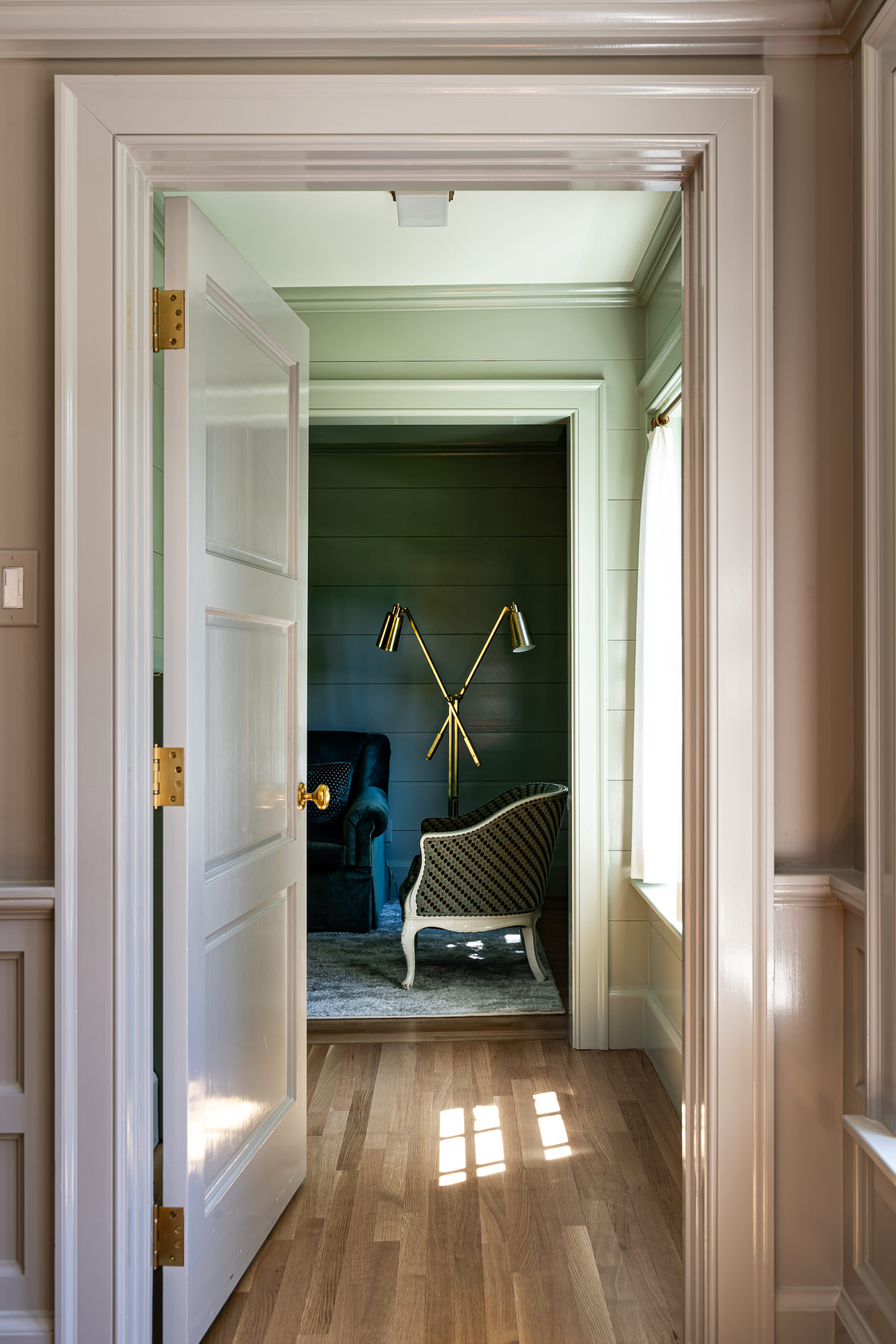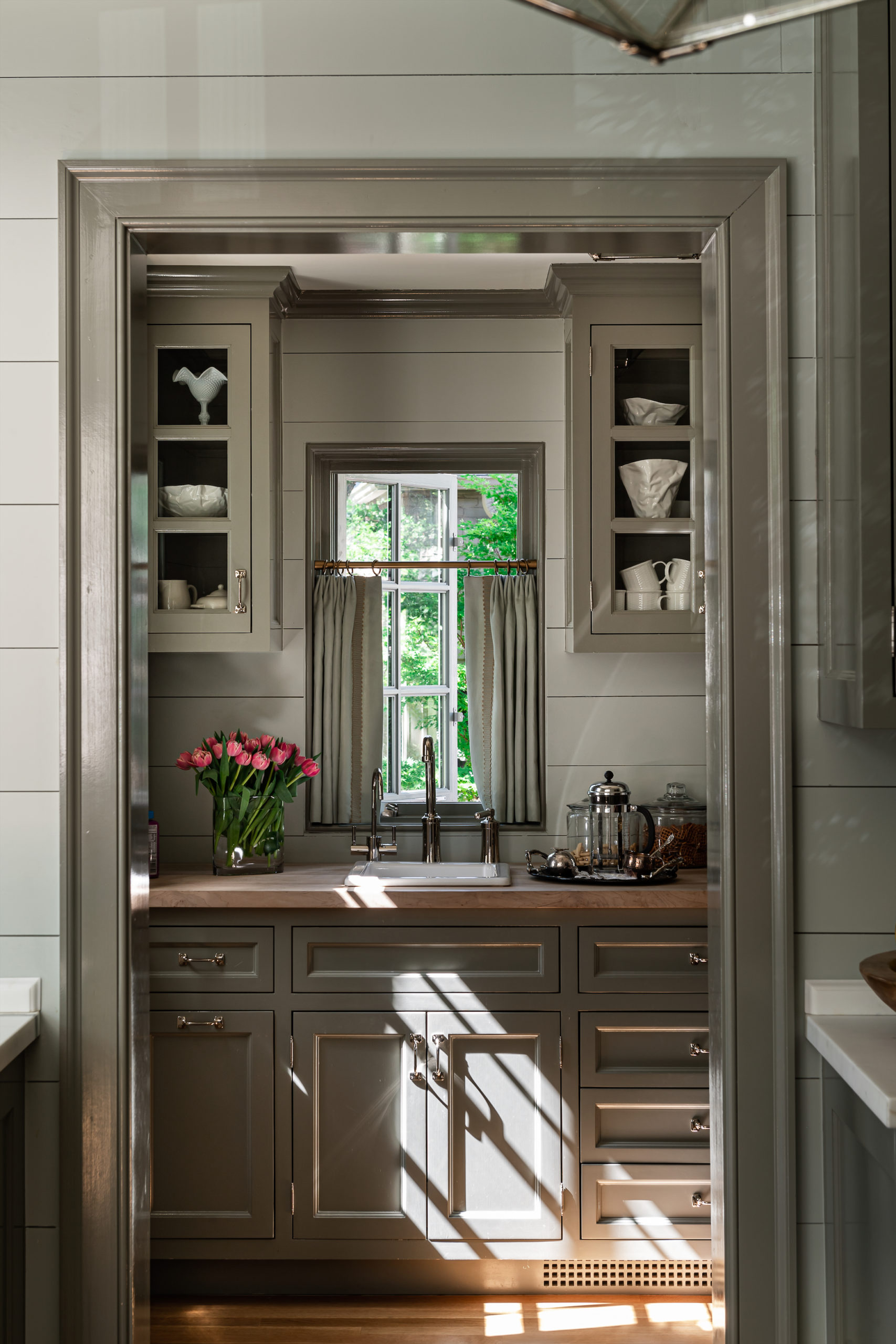 Local artisans crafted the house in much the same way they might have a hundred years ago, with carved plaster and soapstone fireplaces and coffered wood ceilings. In lieu of sheetrock, a mix of oak paneling and shiplap gives texture and interest to walls. Fine brushwork is an art, and skilled painters used brushes to provide subtle depth to painted surfaces. A traditional pier-and-beam foundation gives the herringbone oak floors a firm but hollow sound when walked upon — something you associate subconsciously with old houses. And rooms vary in ceiling heights and volumes, which Sell says is essential for houses to feel welcoming and comfortable. The large, airy kitchen steps down into a cozy den, where the family often gathers. A low-ceiling pantry and coffee bar — two of Lizzie’s favorite rooms — are tucked under the back stairwell. “We have little nooks and crannies in the house with dropped ceilings as well as larger rooms with higher ceilings,” he says. “All these were intentional to add delight to the house — something that’s missing from a lot of buildings today.