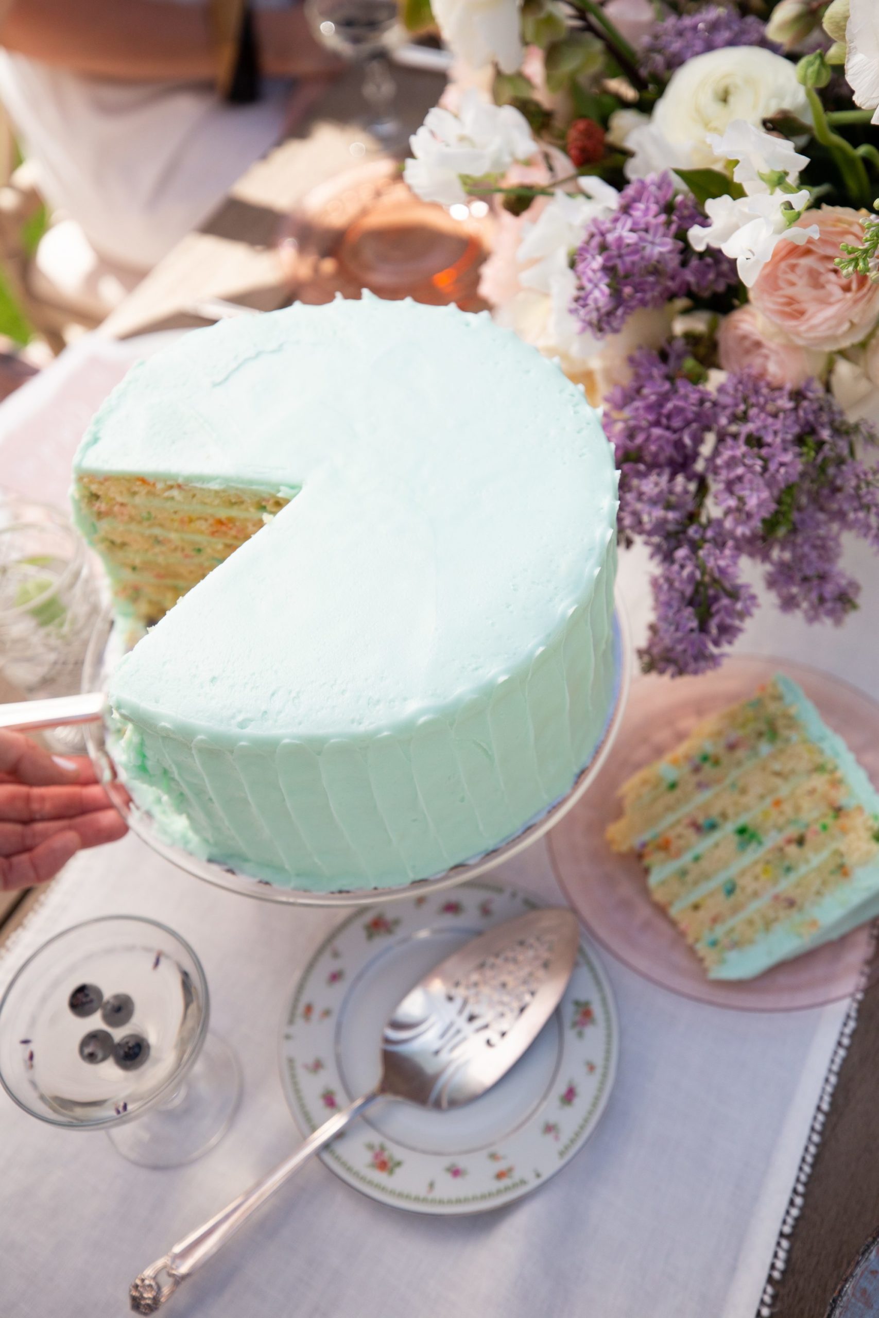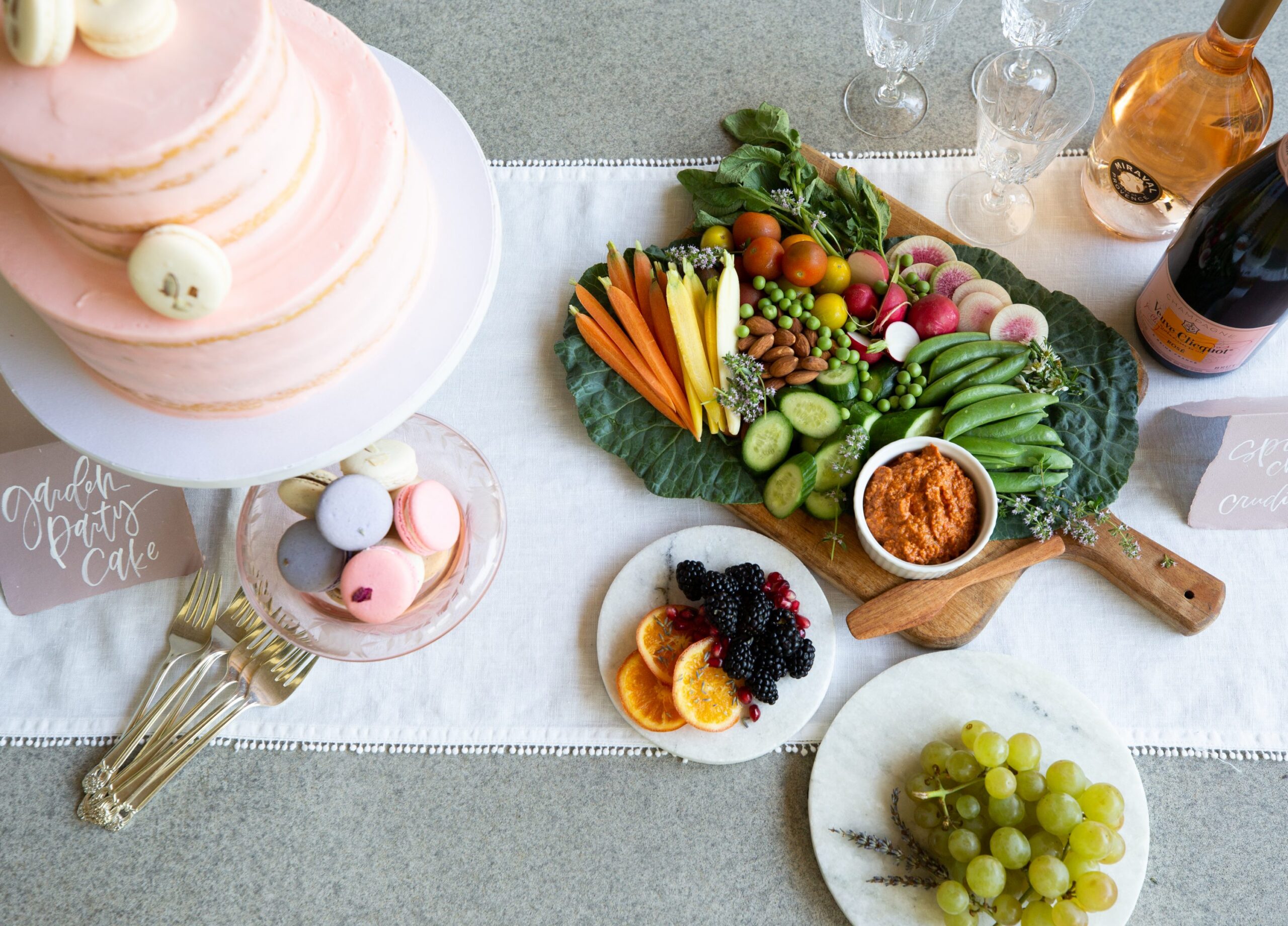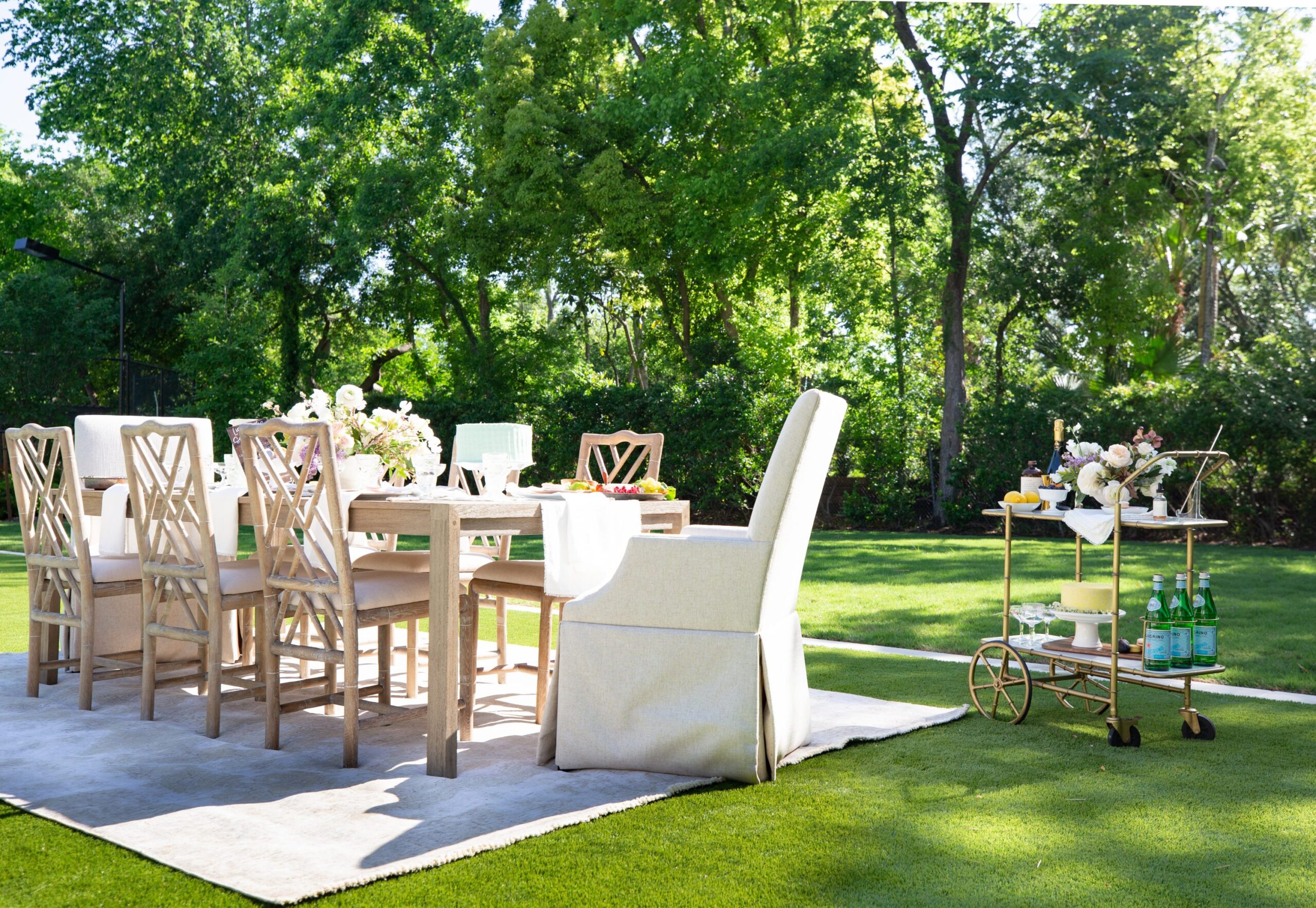 Prosecco cocktails laced with lavender bitters courtesy of Mostess were served up on the covered terrace with a colorful spread of crudités by Smart in the Kitchen before the party moved to a stunning luncheon table situated on the expansive green lawn. Bringing the indoors out with a rug, a table, chairs and even a bar cart one would normally find in a fully dressed dining room creates an intimate vibe for an alfresco affair.