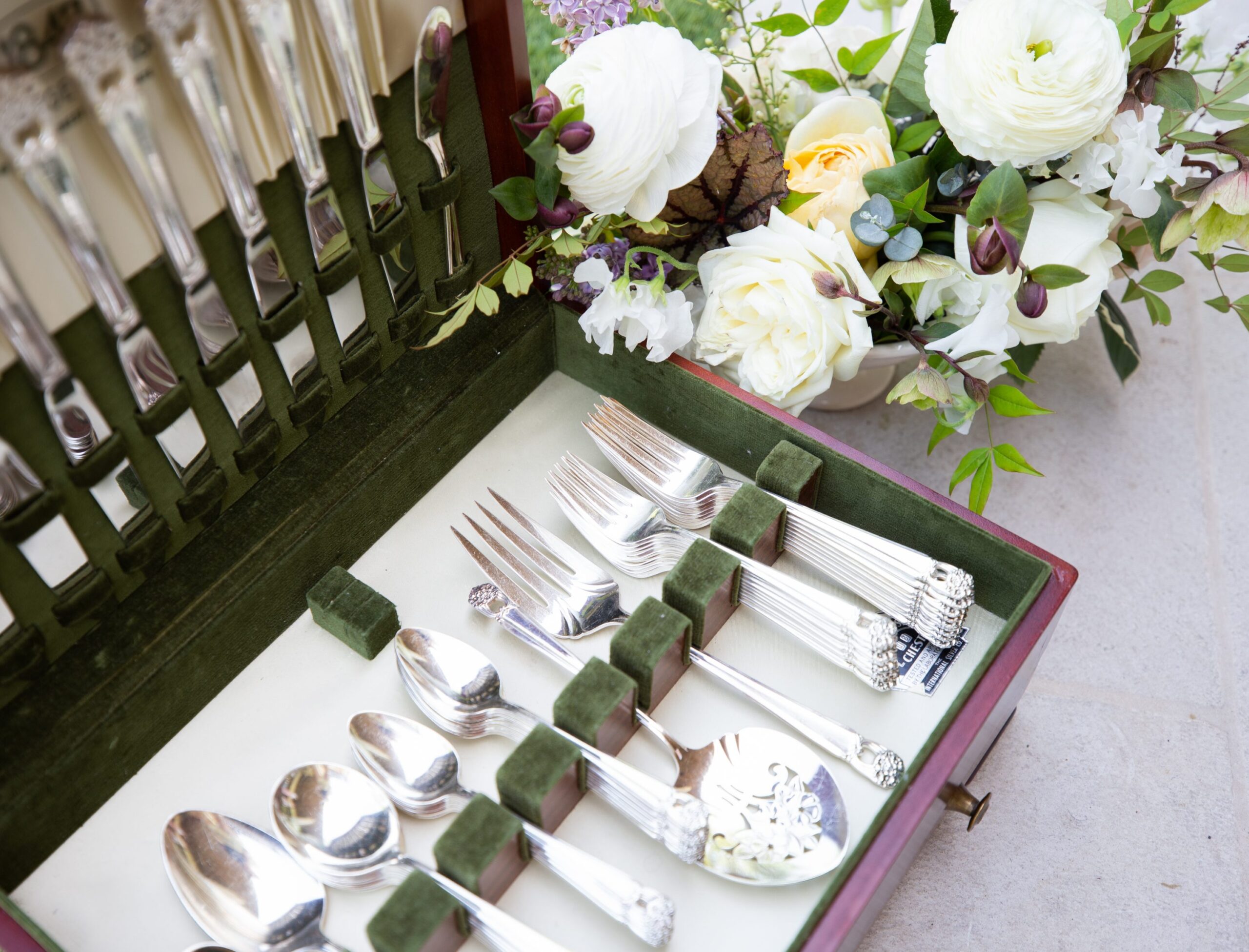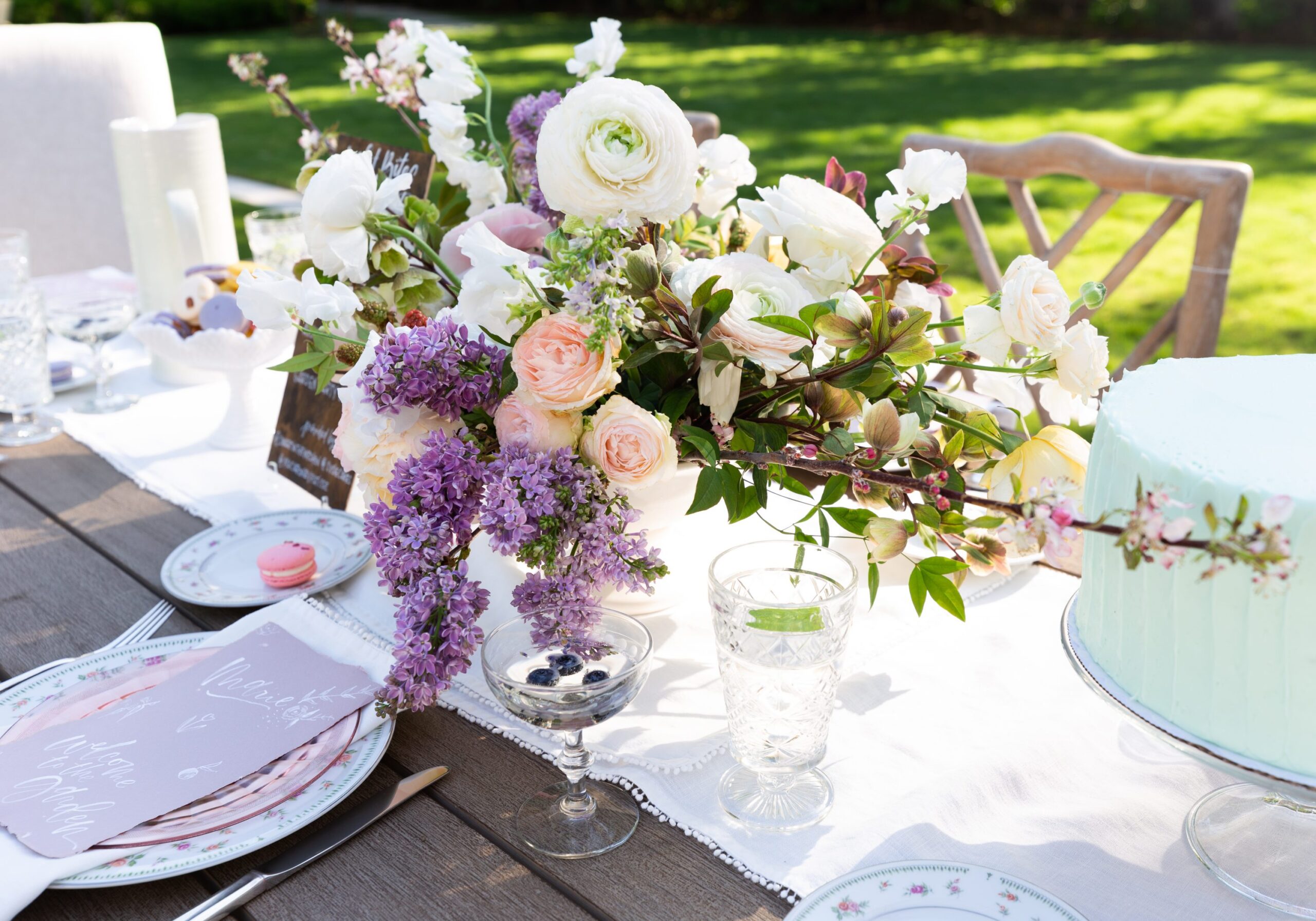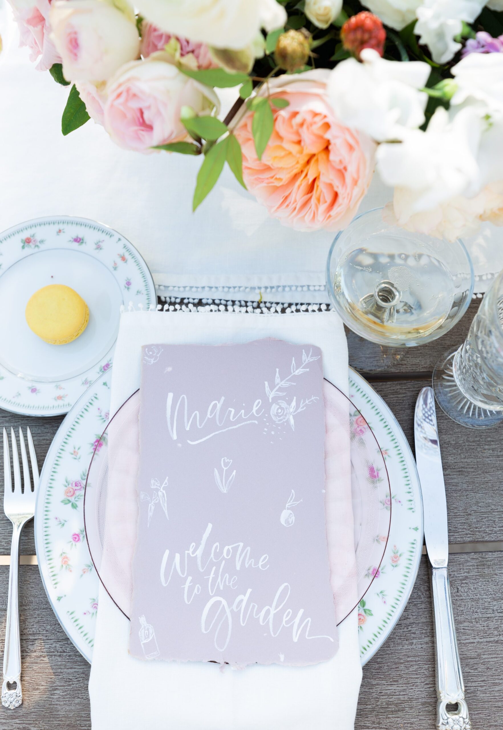 Meg Grant & Co calligraphed place cards with a sweet message in unexpected white ink atop lavender paper that complemented the soft colors of the linens and vintage place settings.