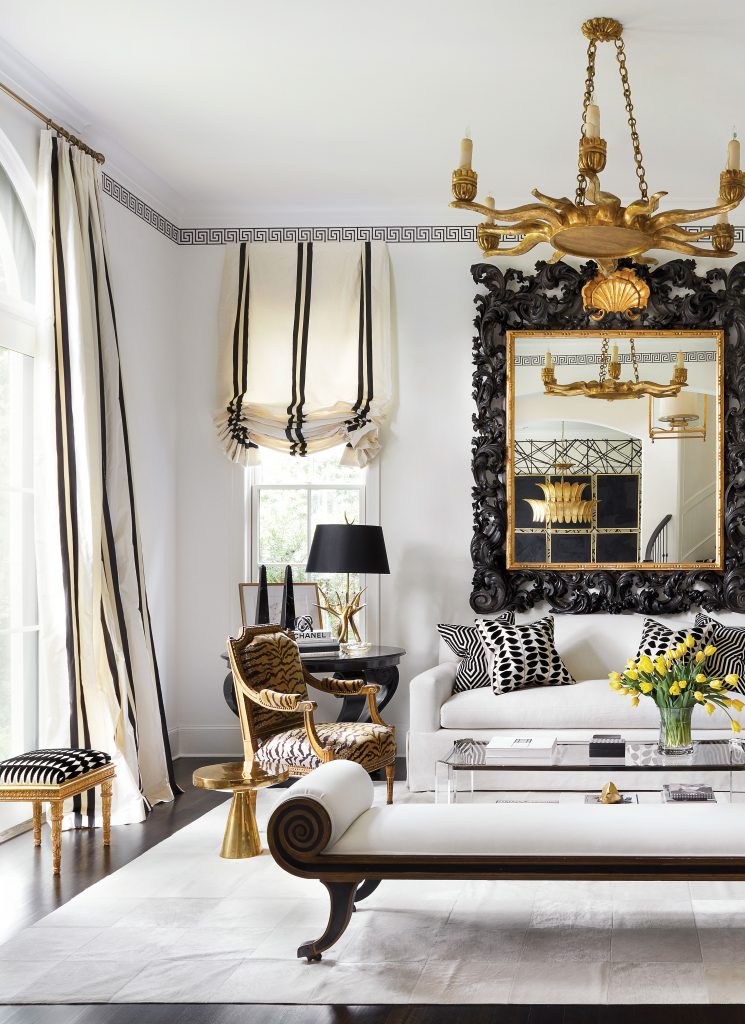 It wouldn’t be a Renea Abbott interior without a little tiger, zebra, or leopard somewhere. Here, however, she’s used it with restraint, and you might have to search a bit to find it. In the living room, Scalamandré tiger velvet covers a pair of carved French armchairs, a claw-footed stool in the family room is sheathed in Brunschwig & Fils leopard, and a zebra-hide rug sets a high-contrast tone in the entry. On the other hand, graphic black-and-white prints dominate, from the Kelly Wearstler wallpaper in the dining room to the living room’s Greek key ceiling trim, striped shades and draperies, and custom pillows in geometric raised velvets.