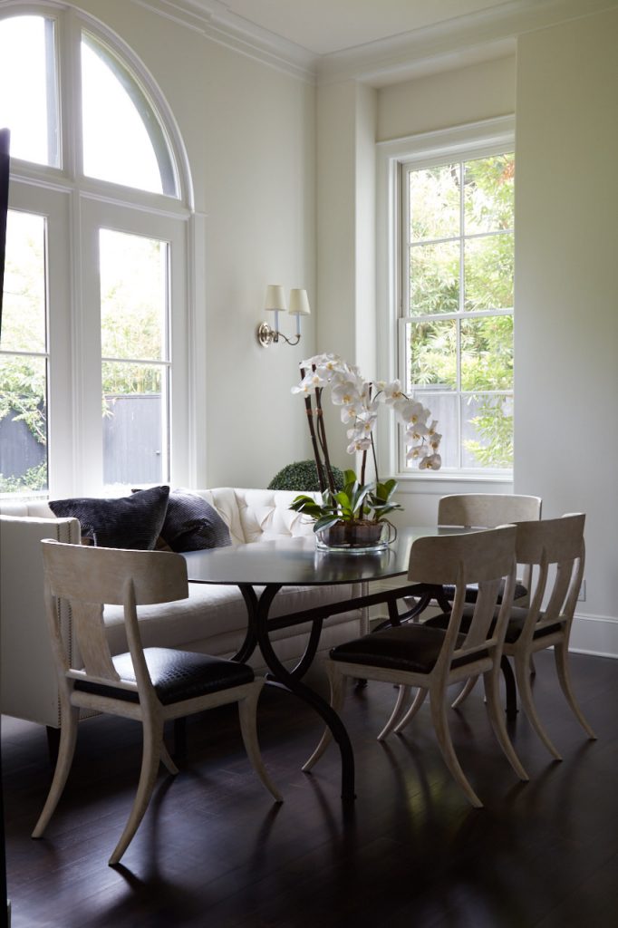 Inside, dark wood floors, elegantly arched windows and doorways, and a curved staircase are a seductive backdrop for Abbott’s cinematic point of view. “I lean towards a Hollywood-glam Dorothy Draper look,” she says.