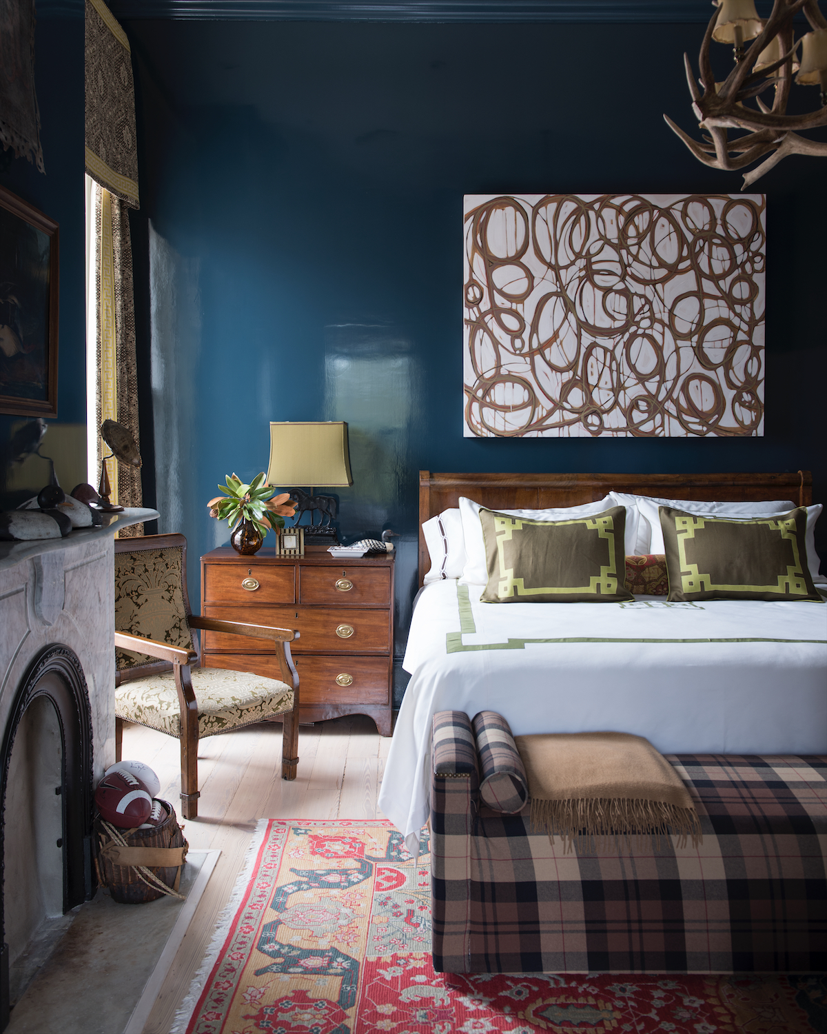 The fun is also in the unexpected mix: In the parlor, antique French fauteuils are covered in Lee Jofa acid-yellow satin, while the upstairs study is cocooned in grays, chocolates, and creams, with floral Schumacher drapery layered against bold geometric Kelly Wearstler wallpaper. An iron bed in the guest bedroom is draped in lively orange and lavender monogrammed