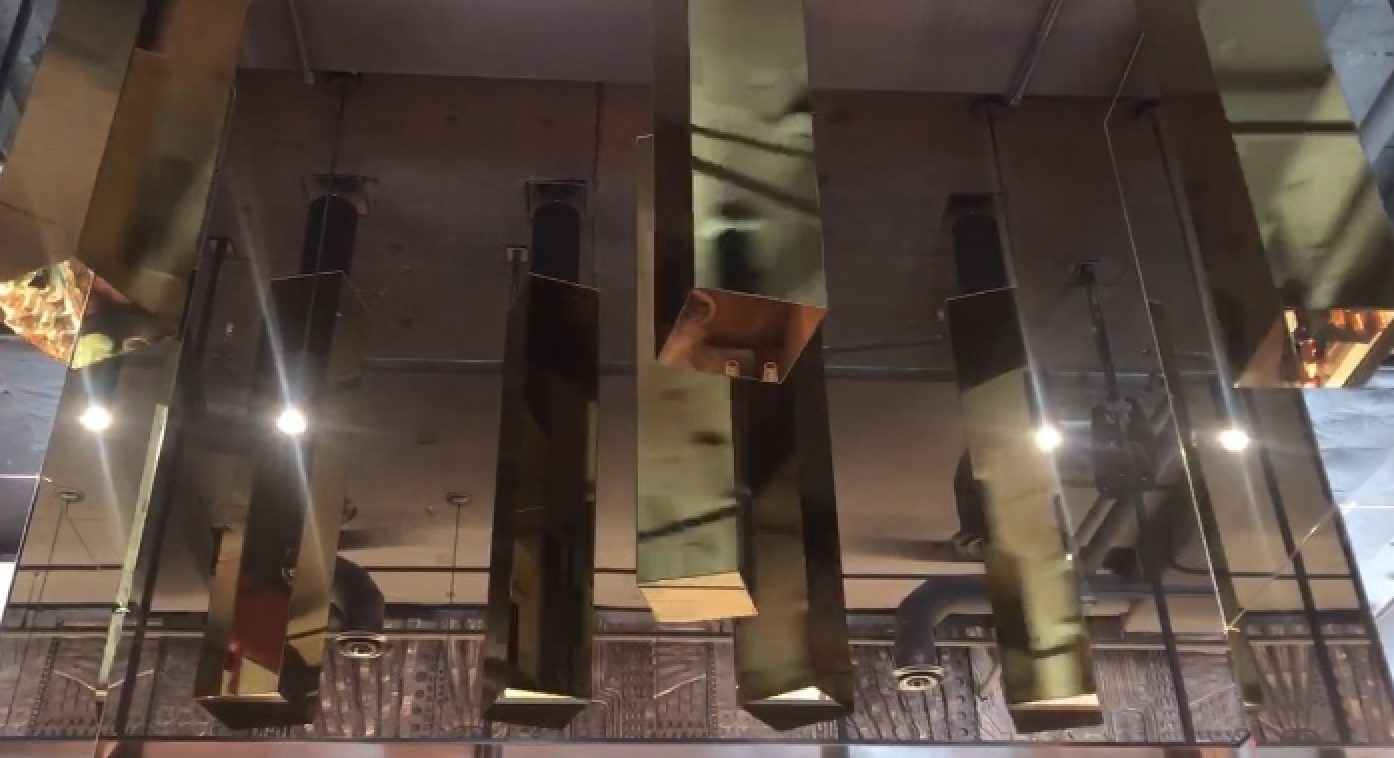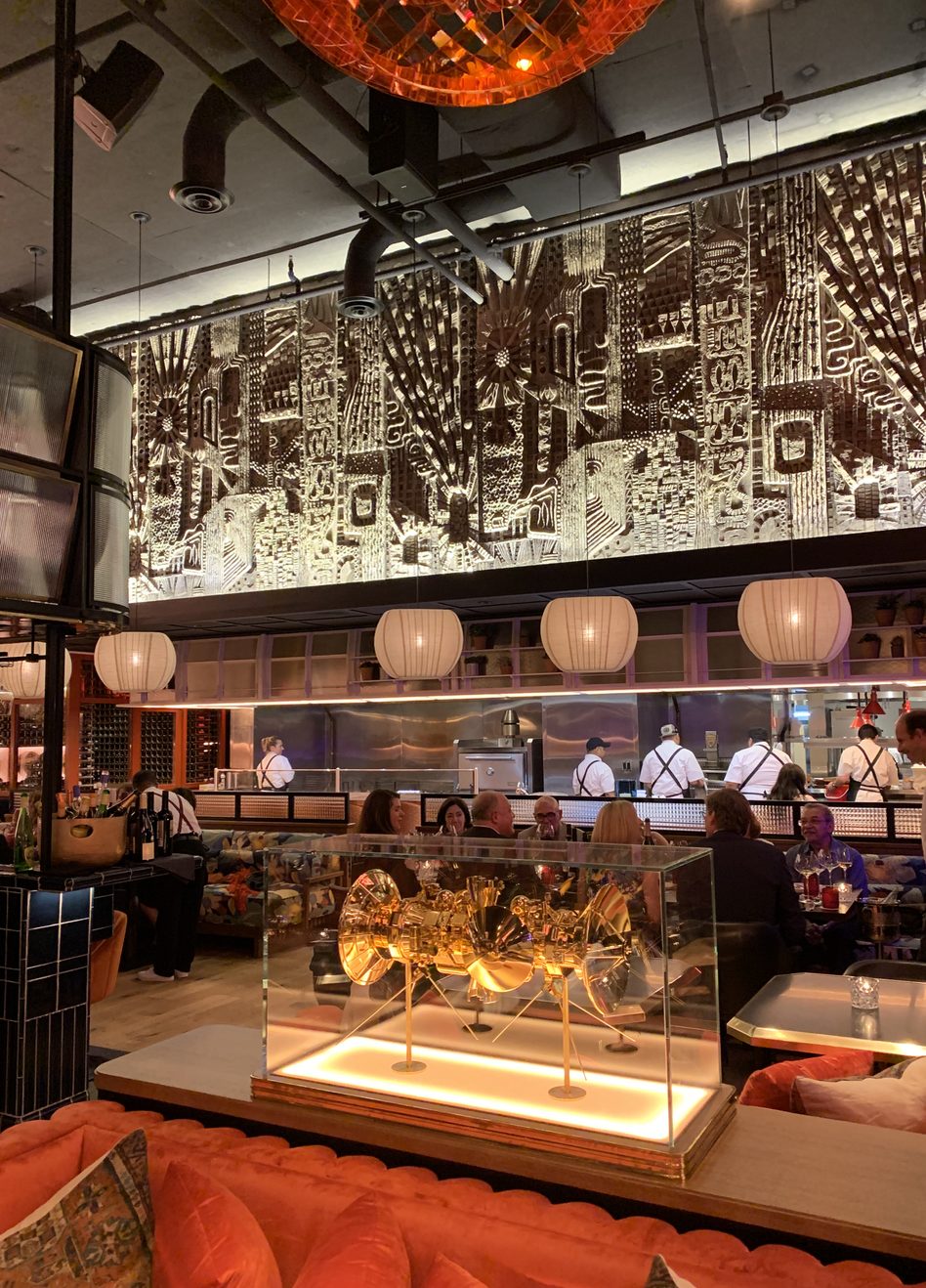 A dynamic, kinetic art installation hangs above the bar, with a life of its own. A series of massive gold-tone mirrored rectangular prisms rotate slowly, sleek images of the restaurant flitting across their surfaces. It’s at once intricate and simple, straightforward and complex.