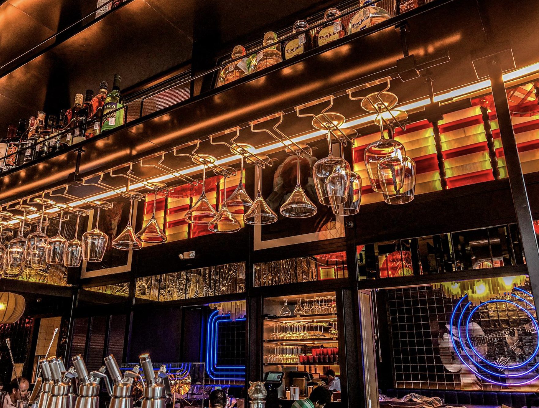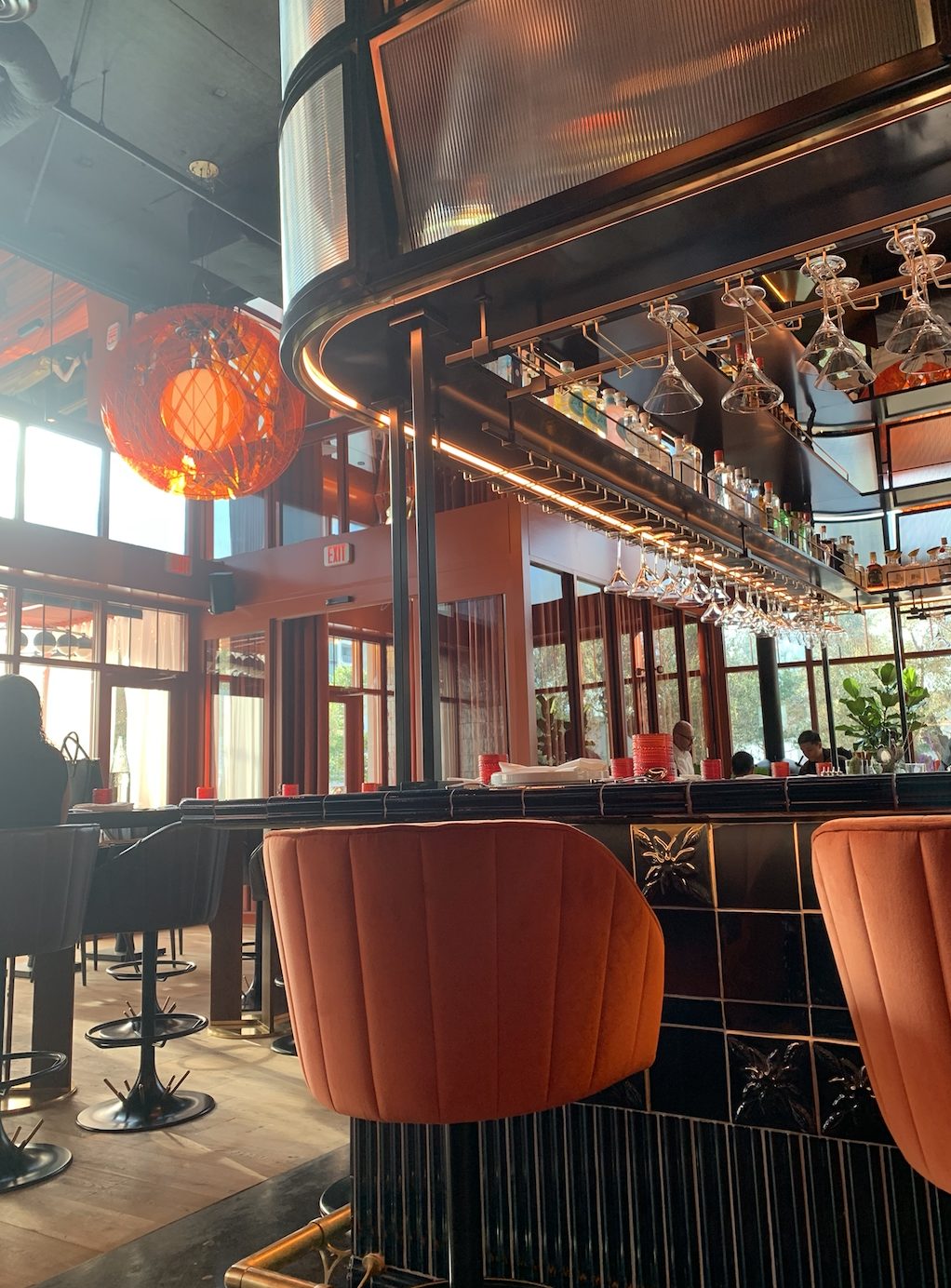 At Houston’s new MAD, bold colors riot all around him, a churning sea of blues and splashes of terra cotta reds and oranges. Not just the plush banquettes and the soft pillows, but the neon indigo lights framing the private areas with contrasting red and blue tile udnerneath, and the striking orange, almost reticulated, orb light fixtures hanging from the high-as-can-be ceilings.