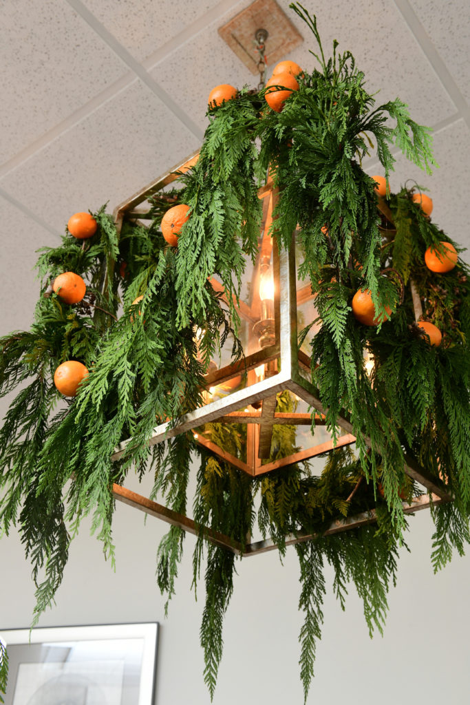 In contrast to shimmering Baccarat tablescape, Design House principal Connie LeFevre says of her table, “We decided that we would go the other way. So we went more casual.” A rustic wooden table and chairs, a floral centerpiece built on a specially-made gutter (yes, like on a roof), metal chargers, and a bounty of magnolia leaves, white ranunculus and red berries set the beautiful table.