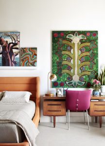 Her artwork hangs everywhere, including a large collage she made from Jack Lenor Larsen green velvet and her highly patterned paintings. There are also works given to her by artist friends, such as late regionalist Otis Dozier, a member of the legendary Dallas Nine. A rosary sculpture made of cast-wax grapes by Linda Ridgway hangs from the ceiling in front of the walnut wall, and two walking sticks with the 10 Commandments carved on them by street artist Roosevelt Wilkerson lean in a corner of her bedroom.