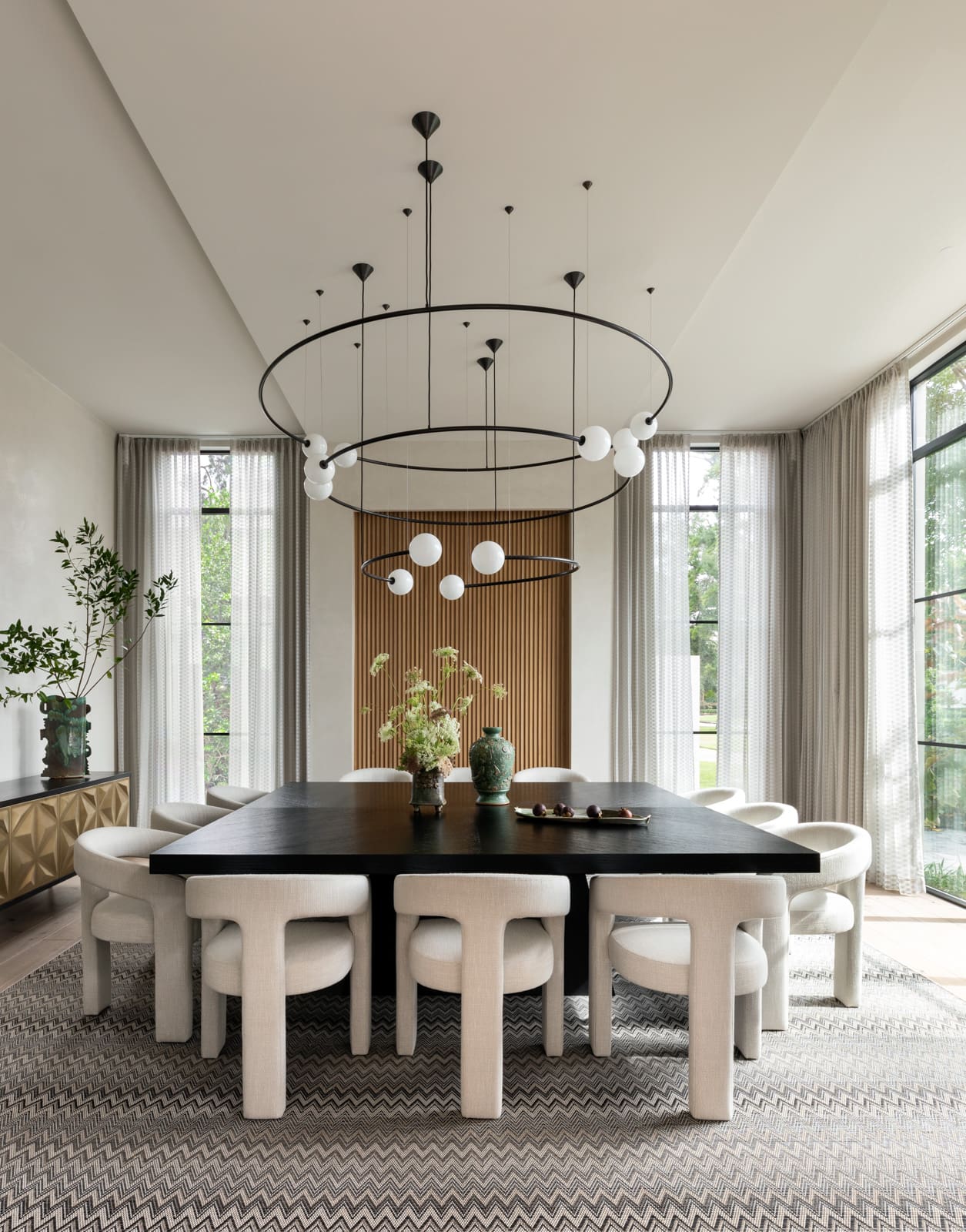 “This dramatic dining room is clearly the beneficiary of the striking interior architecture, but nonetheless the scale and palette of furnishings does a wonderful job of enhancing it, especially when viewed in context to the sculptural stair and spaces adjacent.” — Patrick Sutton