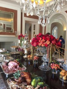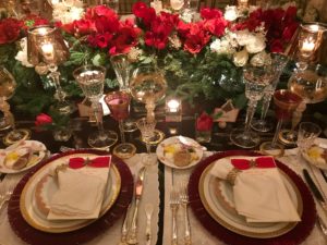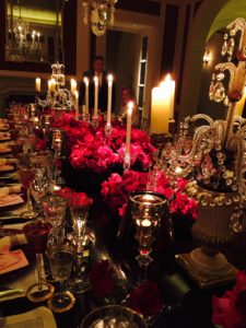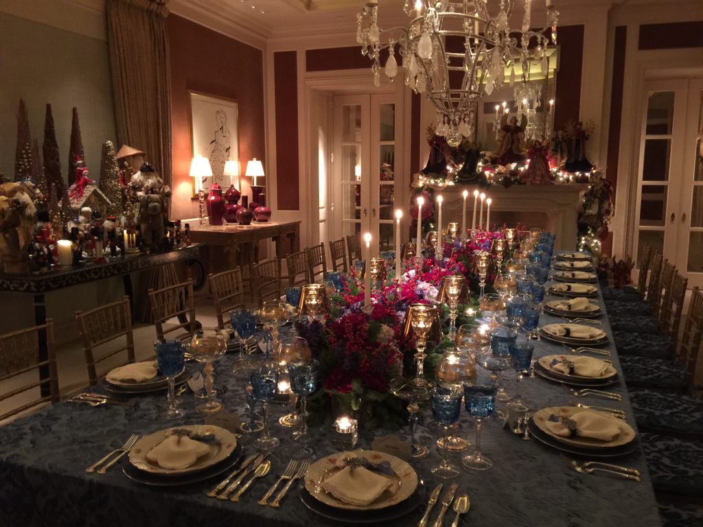 From the shelves to the tables, regularly moves a stunning array of Royal Copenhagen’s Flora Danica, Wedgewood’s Wild Strawberry, Herend’s Bouquet de Rust and Royal Doulton’s Carlyle, to name a few. Of her three silver patterns, Romance of the Sea by Wallace is one she frequently uses. Her crystal is typically Saint Louis in various color incarnations, occasionally mixed with Waterford goblets and Baccarat stemware. The piece de resistance of her tablescapes, beyond the flowers, are the grand crystal candelabra from Baccarat.