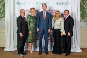 PC Moment: Legendary quarterback Peyton Manning, with two Super Bowl rings and five NFL MVP Awards to his credit, shared his gridiron wisdom with the gathering of more than 480. While his interview, conducted by Spencer Tillman, was entertaining, the height of the night might have been the riff on Manning’s ad for DirectTV in which he wore a plaid robe. At the start of the dinner fundraiser, TEACH co-founder Susan Sarofim and Tillman approached the stage in matching white bathrobes and presented one with a TEACH logo to Peyton Manning.
