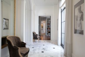 But what really sends us over the moon about this house is its interiors. In a palette of basically black and white with accents of gold, the various rooms shine with rich moldings and woodworking, white marble and polished wood floors, iron window frames and cast stone and marble mantle pieces.