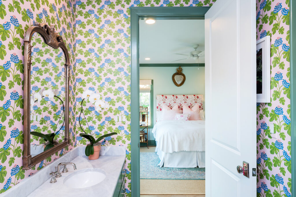 Allen Martin’s passion for integrating her art into the home is evident as one moves from space to space, both indoors and out. “This home is the purest expression that I have ever produced outside of my paintings,” she says. “My mom designed houses growing up and we drove to Baton Rouge and New Orleans to select antique lighting and designed multiple custom lanterns. My mom found the fireplace mantel from an antiques dealer that had purchased it in the south of France, acquired the oversized antique pantry doors, and helped me custom mix the majority of paint colors throughout the home.”