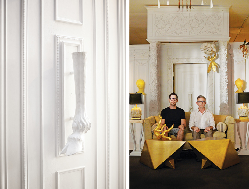 “His ideas fly out of his head so fast, you have to be ready to catch them,” says nephew and head fabricator Ely Sellers, who began as an apprentice eight years ago. “I never went to college and was working at a restaurant. He said, ‘Hey, you can live with me and work with me.’ I jumped on it. It’s a slow climb, and I’m still growing. But I’ve always believed in him.” The two collaborate on all projects, including an upcoming furniture collection for Neiman Marcus; a zoo-full of plaster animals, available at Grange Hall in Dallas; and a 4-foot-tall spider for Bergdorf’s Christmas window, the fourth that they’ve done. “It will be covered in one-eighth-inch-long quartz crystals,” says Ely, “so it looks hairy.”