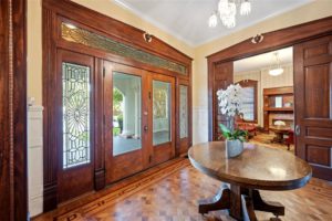 And things truly have been beautifully preserved. Precious, century-old details like a hand-painted fireplace, the leaded glass that frames the entryway, and original oak paneling remain in all their glory. Even the hardwood floors, with their stunning five wood border inlays, are still standing strong.