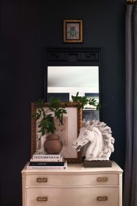 “All these things spoke to Tracy’s soulfulness,” Reitmayer Sano says. “We mixed them with furniture they had and new pieces we bought. It’s layered — like how she dresses.” The dark walls in Behr’s Cracked Pepper combine with rich materials such as brass, marble, live-edged wood, and leather to “make it all a little more sexy,” says Reitmayer Sano. “It also gave it more of a masculine vibe that Van loves.”